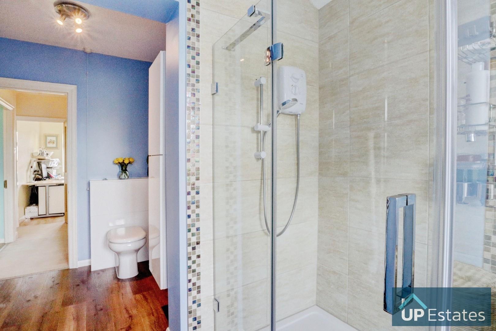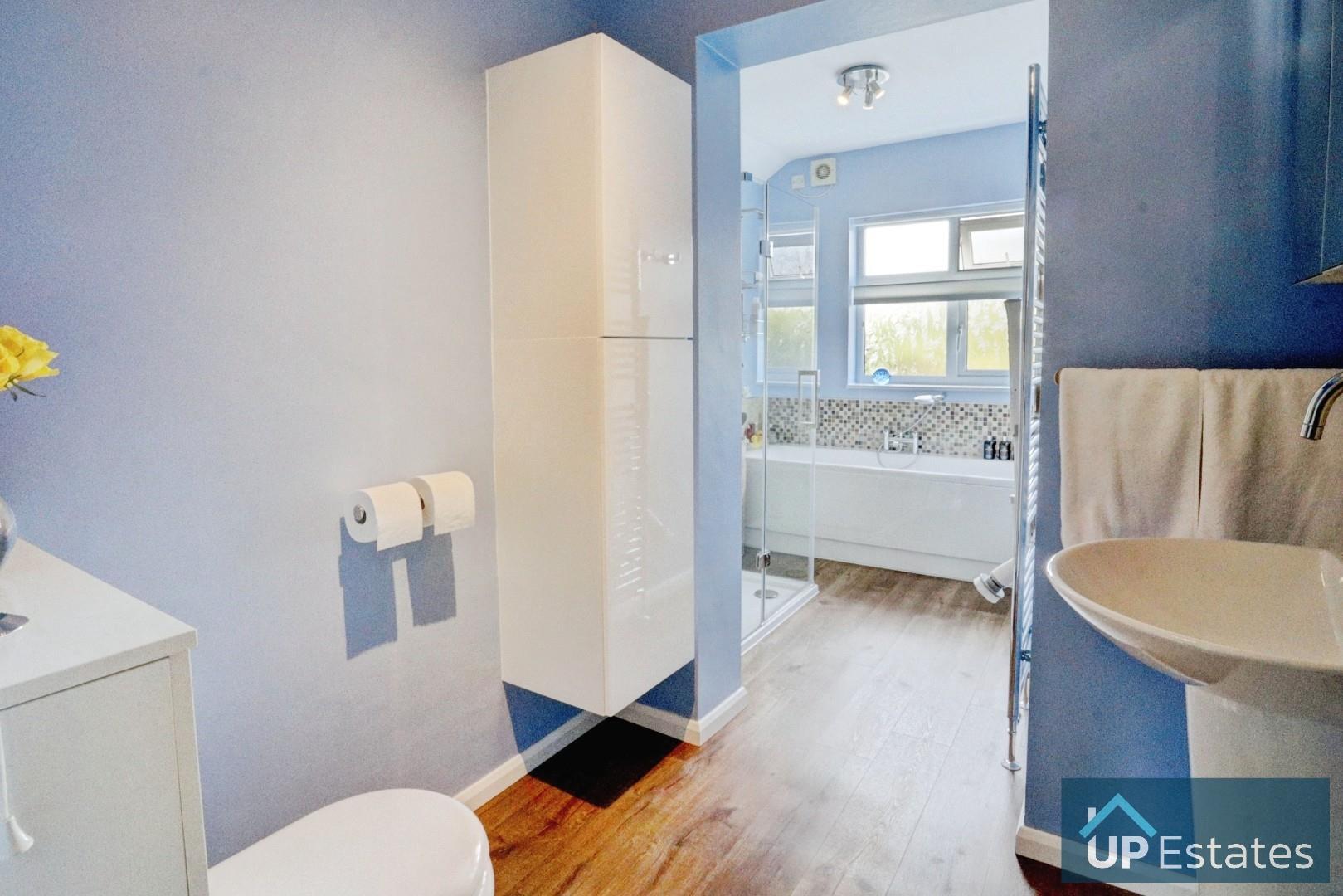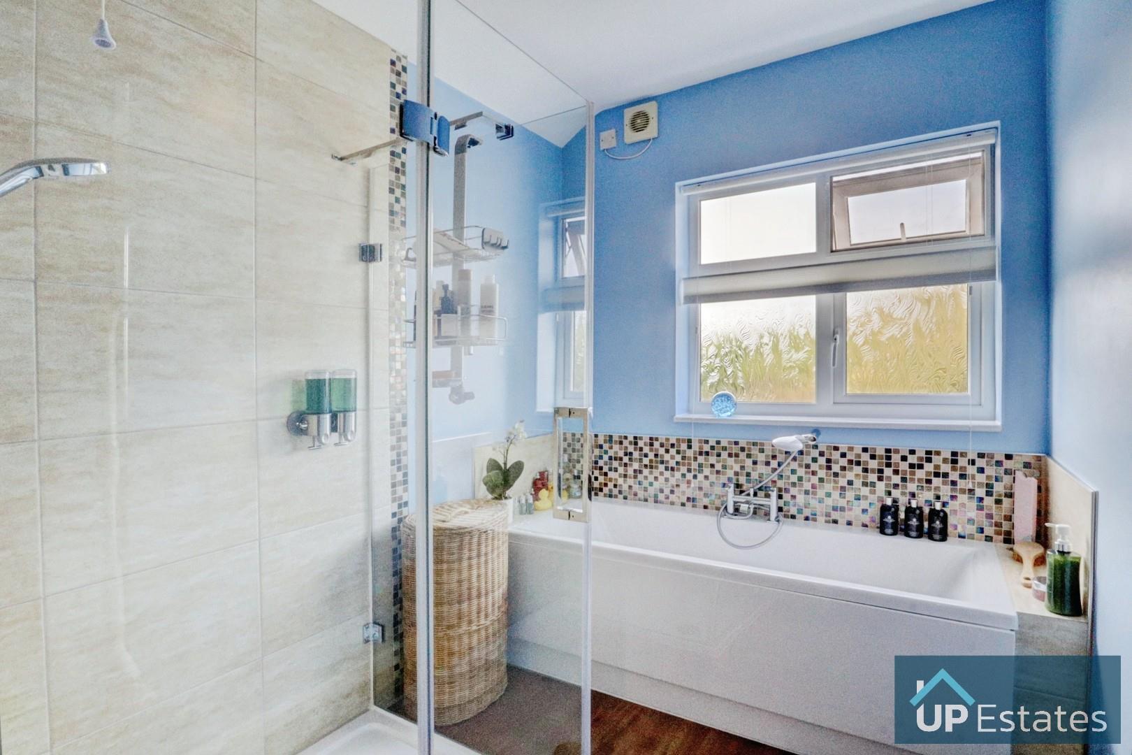 Upstairs, the extended family bathroom is fitted with a mirrored bathroom cabinet, a storage cupboard, bath and separate shower.