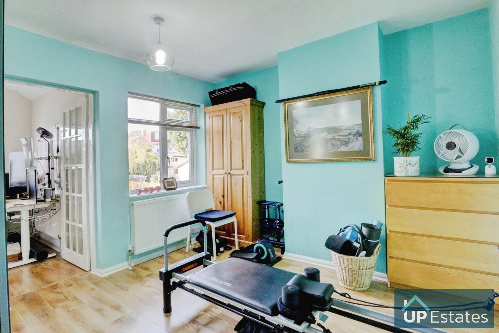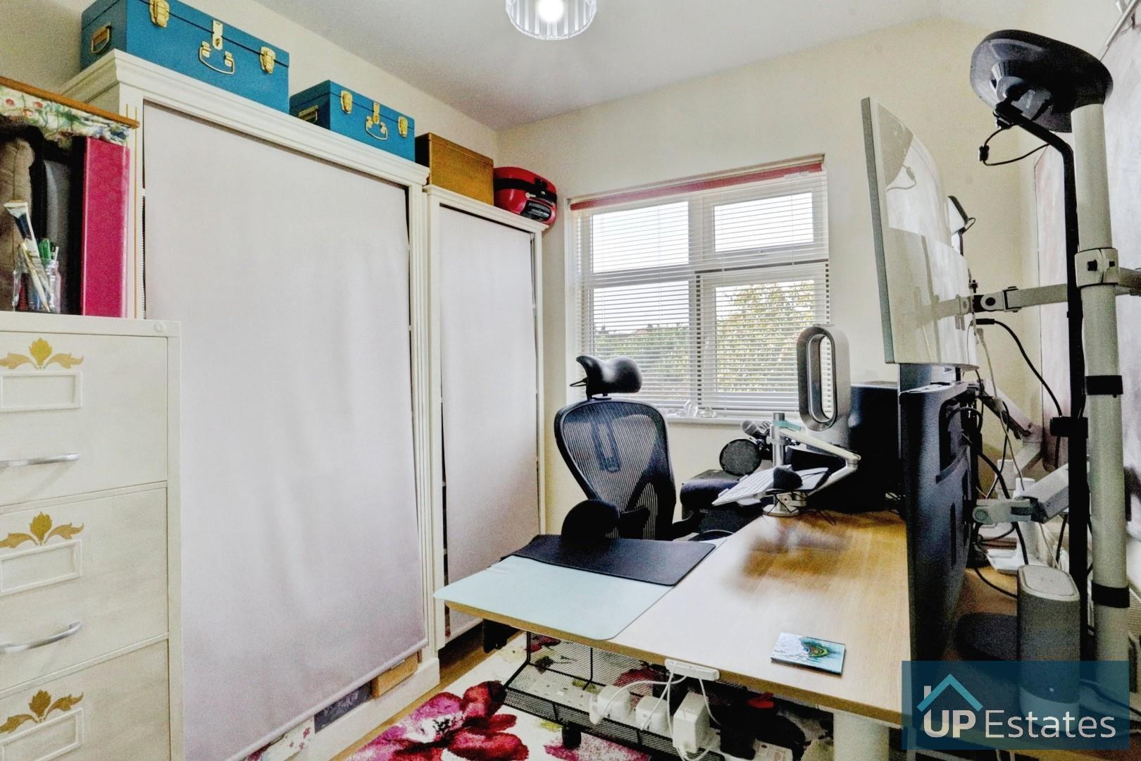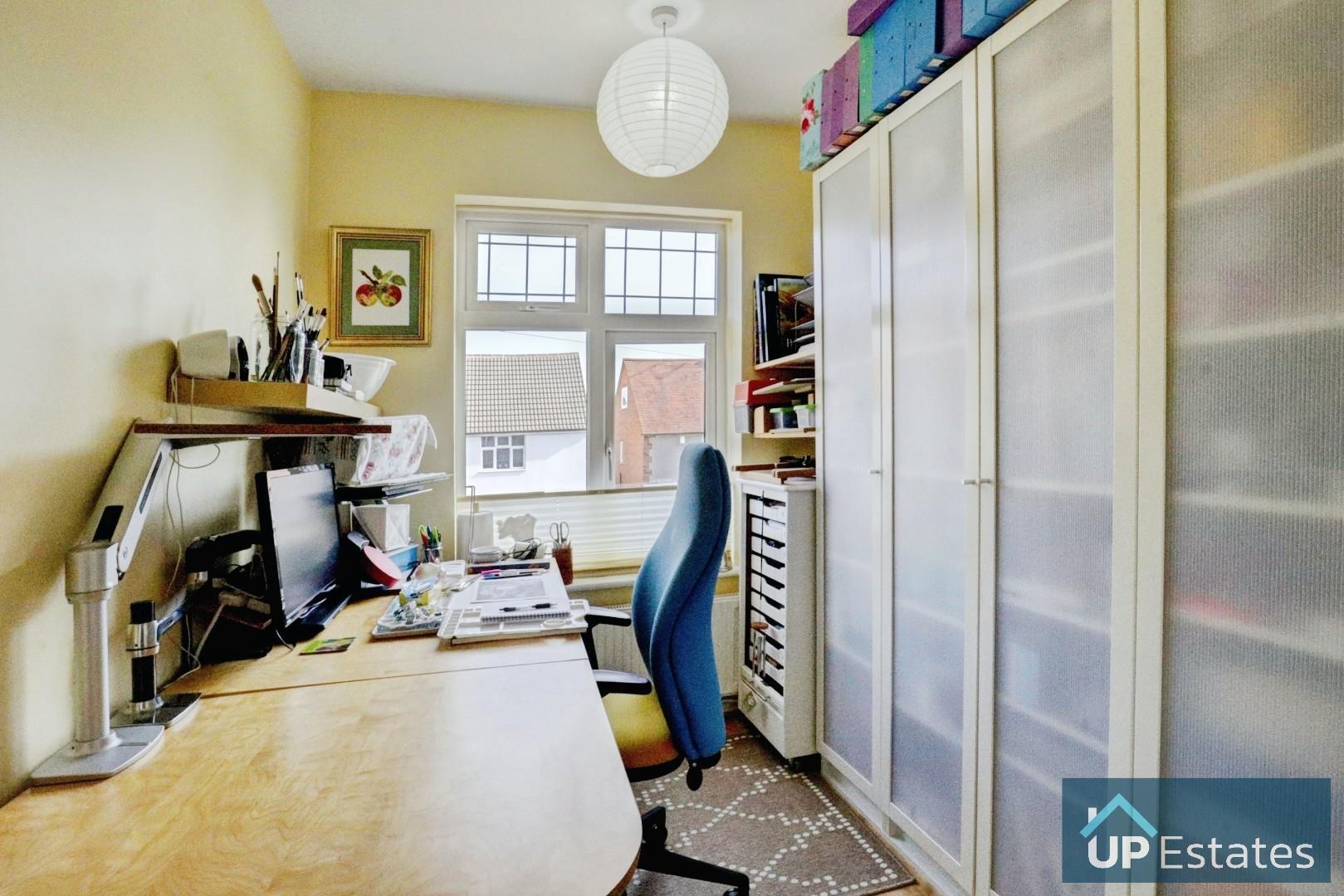 There is a single front bedroom, the main double bedroom with fitted wardrobes and bay window, plus a rear double bedroom with fitted wardrobes that leads to a separate home office, that is versatile as a potential fourth bedroom, nursery or dressing room. The rear garden is mature, private and secure, while the attractive front garden features borders and a flower bed surrounded by blue slate chips, alongside a driveway. The home enjoys full fibre broadband, a gas fire, and a Baxi boiler (serviced July 2025)