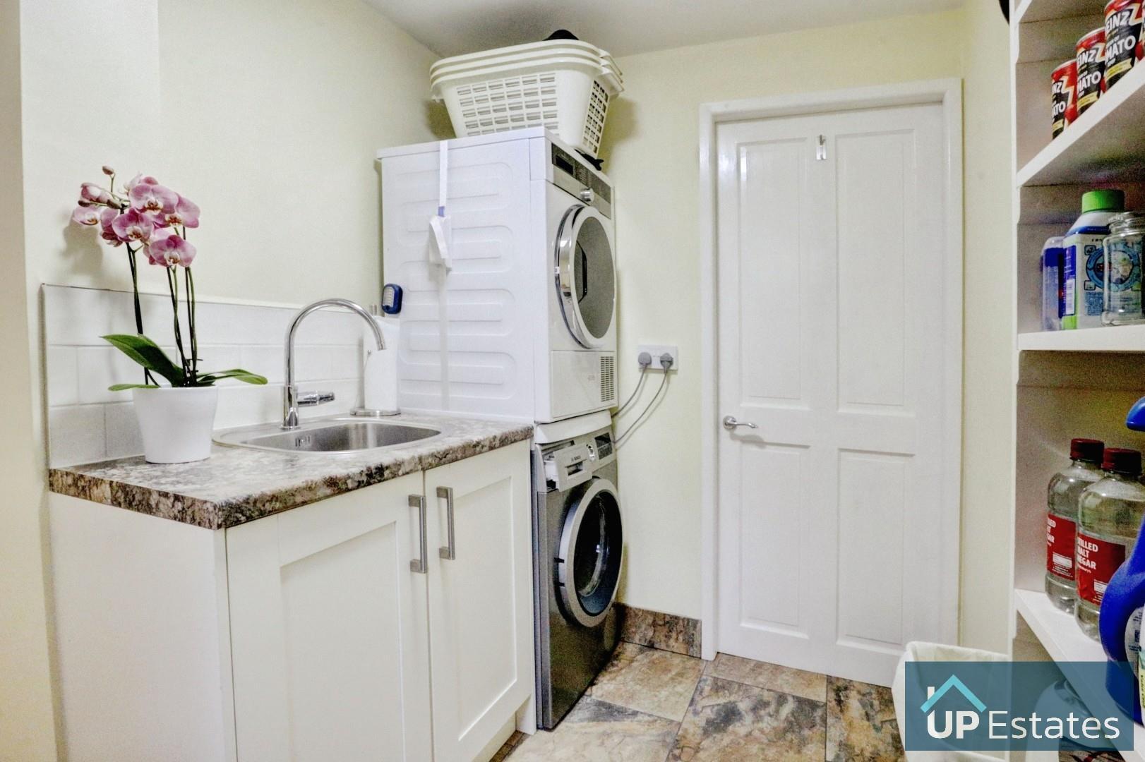 The kitchen includes an integrated double oven/grill, gas hob, and space for a dishwasher and fridge/freezer. A key feature is the utility room with useful sink, space for stacked washing machine/tumble dryer, offering three way access (kitchen, garden, and side passage).