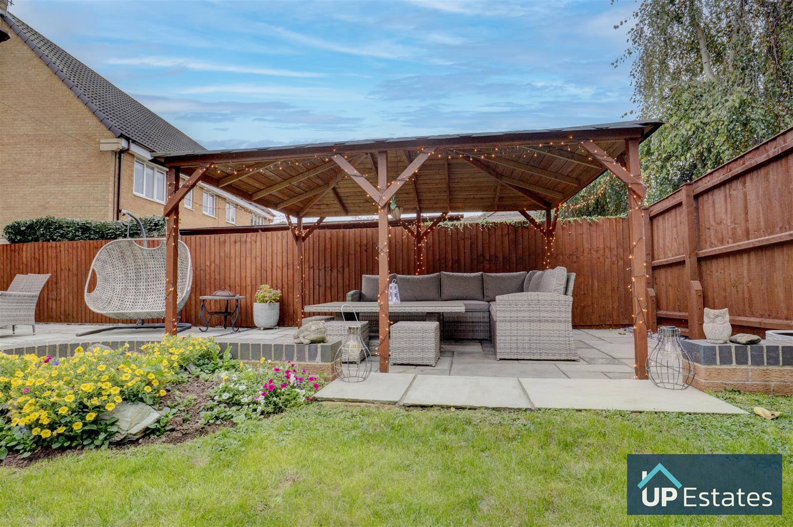 Externally, the rear garden wraps neatly around the property, with a wooden gazebo providing a charming spot for outdoor dining or entertaining. To the front, the property benefits from a spacious double garage and a driveway with ample parking for up to six vehicles.