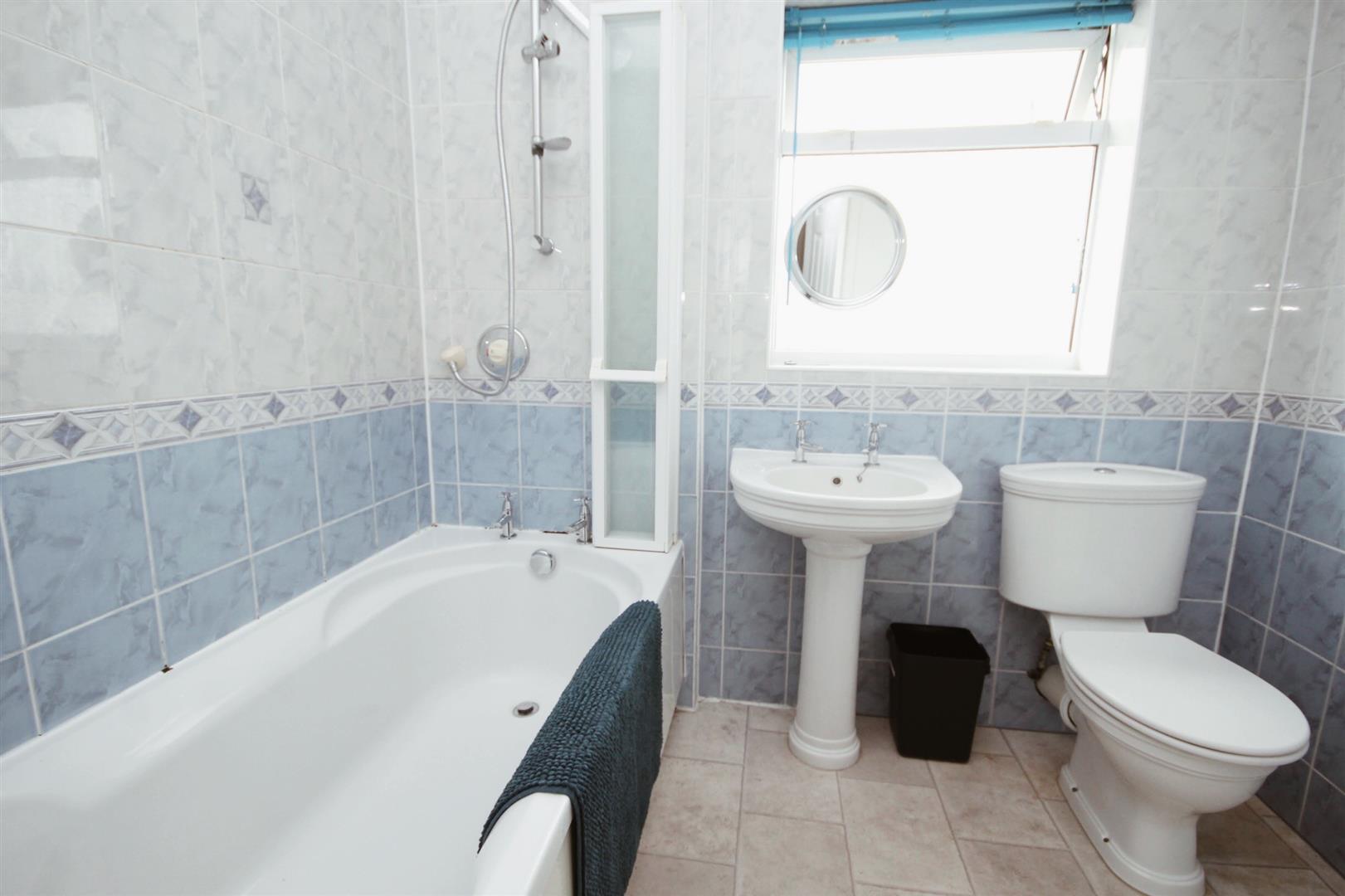 A fully tiled bathroom with a bathtub with shower over, pedestal wash basin, low level W/C and double glazed opaque window to the rear aspect.