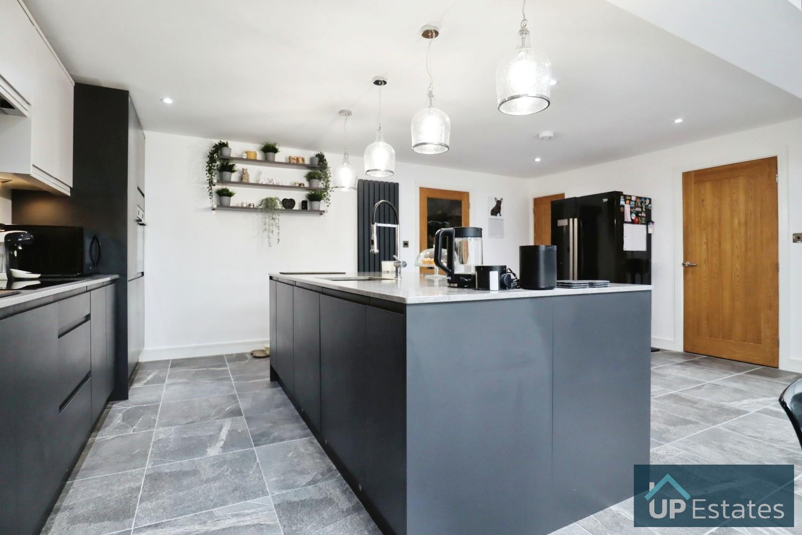 A stunning refitted modern kitchen boasting a matching range of wall and base mounted units including larder with granite worksurfaces over including central island, central heated radiator, integrated appliances including; two ovens, induction hob, inset sink with spray tap & dishwasher with space and plumbing for appliances. There are doors opening to the WC shower utility, storage cupboard and the room flows through to the extended lounge dining area.