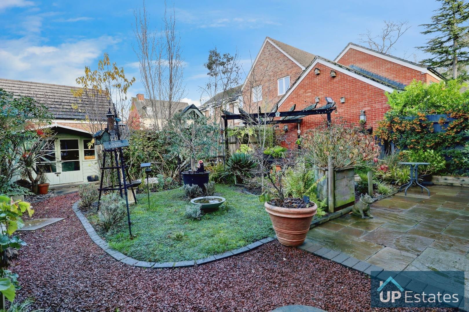 Externally, the property boasts a beautifully landscaped rear garden, complete with lawn, patio areas, pathways, and a charming summer house. To the front, a driveway provides parking and leads to a single garage.