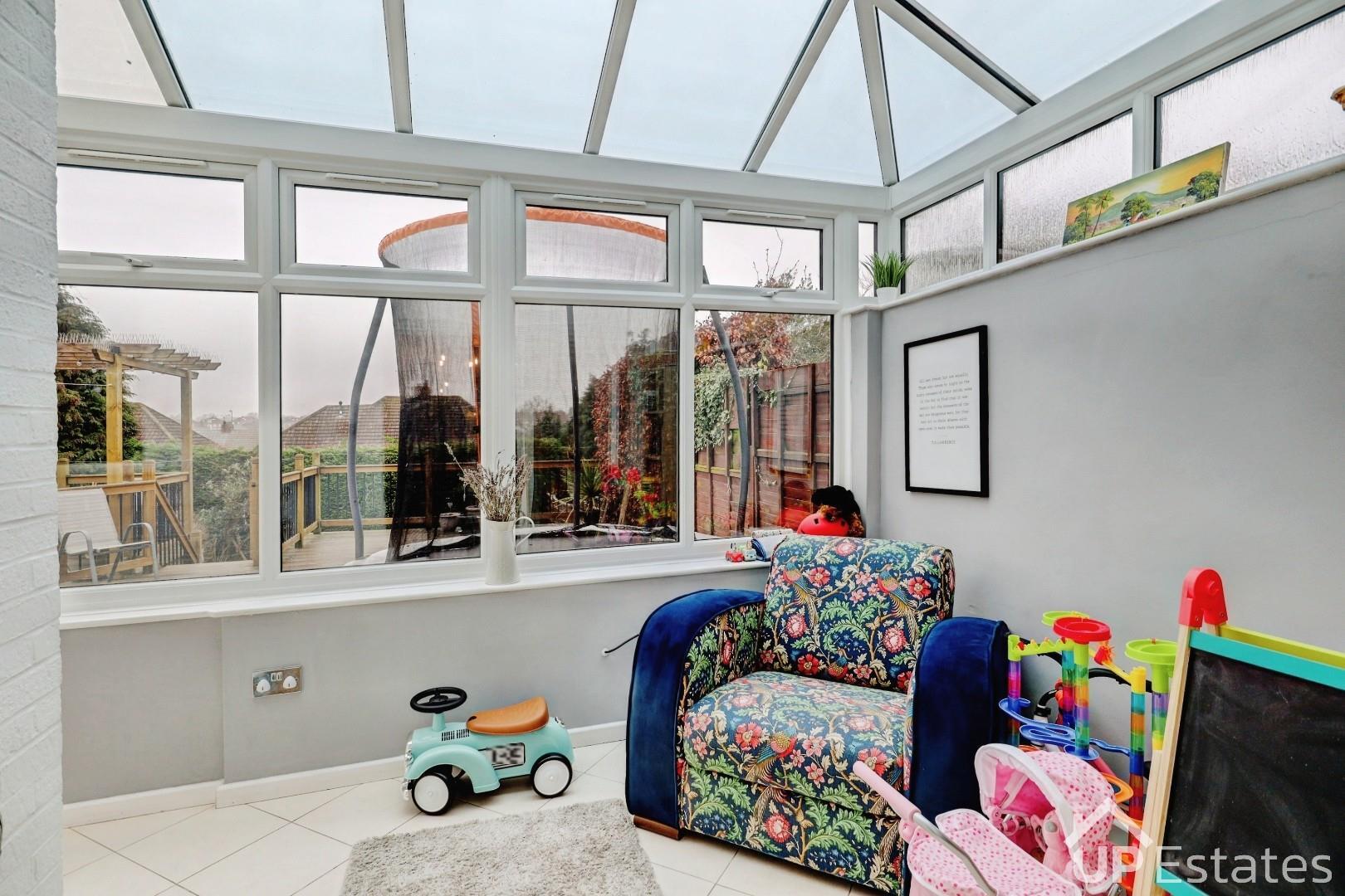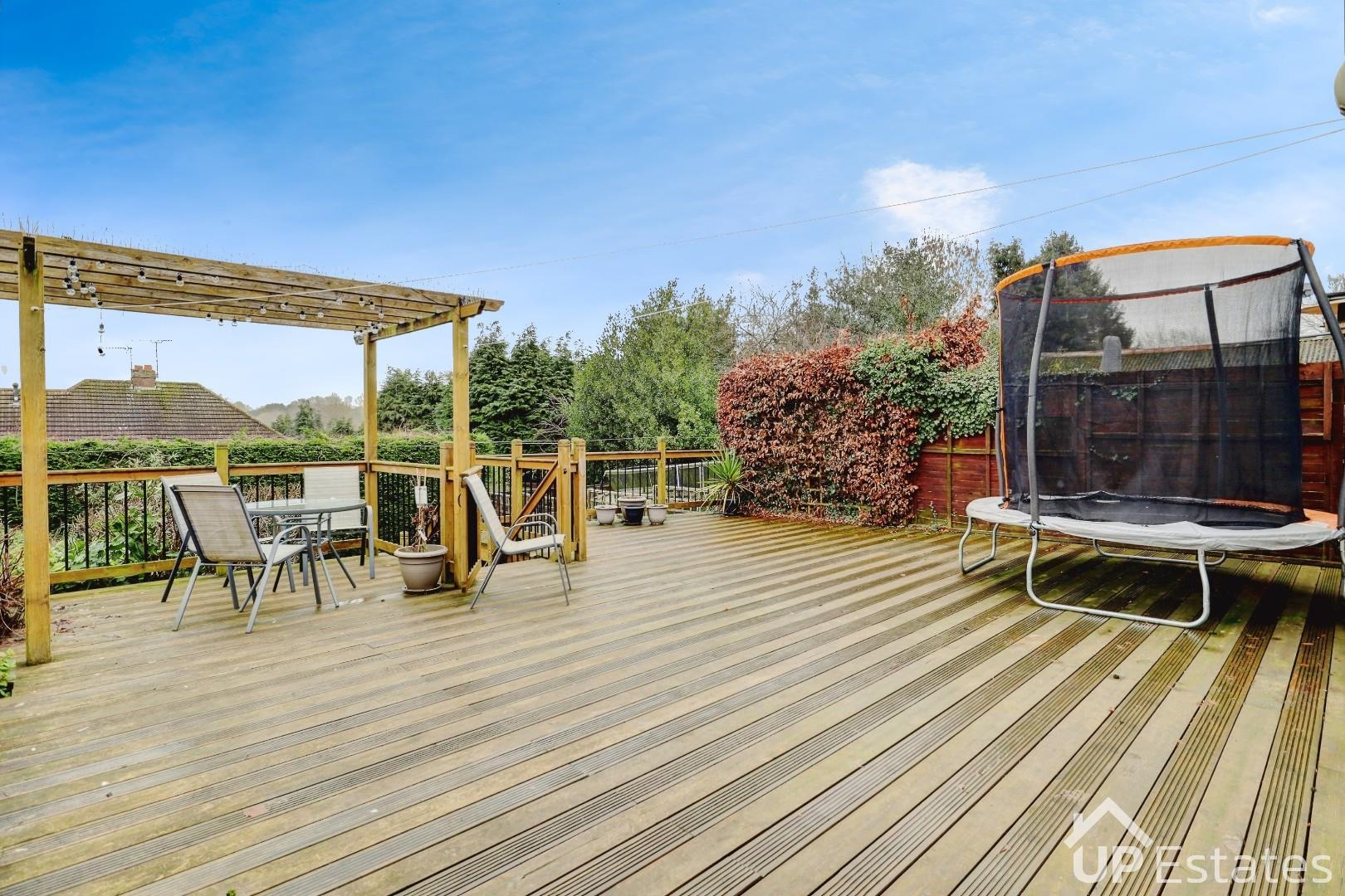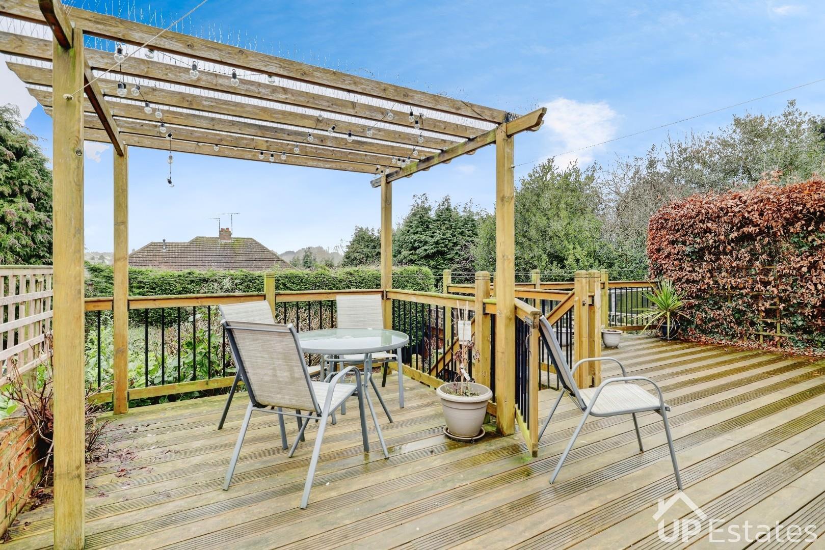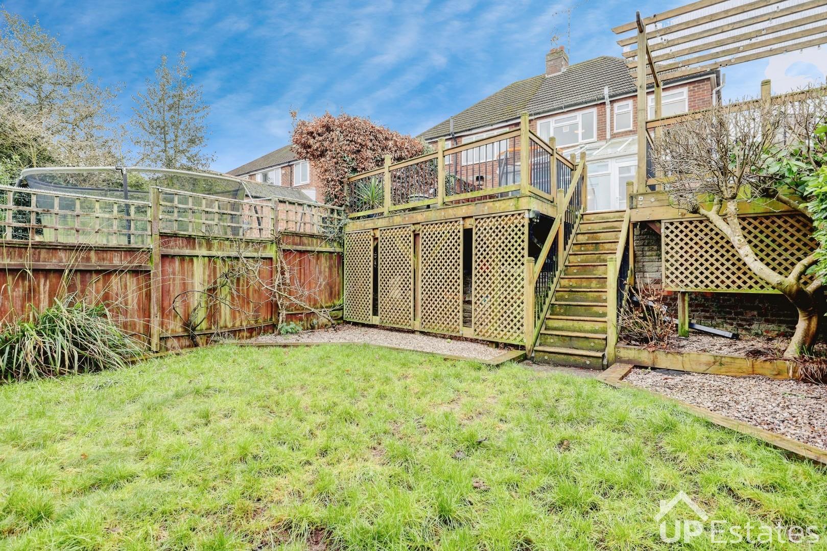 The conservatory benefits from a downstairs WC and provides further access out to the rear garden. Upstairs, the property offers three spacious bedrooms, including two generous doubles with built-in storage and a large single bedroom. A well-proportioned family bathroom completes the first floor. Externally, the rear garden has been thoughtfully designed with a large decked seating area, steps leading down to a well-maintained lawn, and useful storage beneath the decking. To the front, there is a spacious driveway providing parking for multiple vehicles, along with access to the garage.