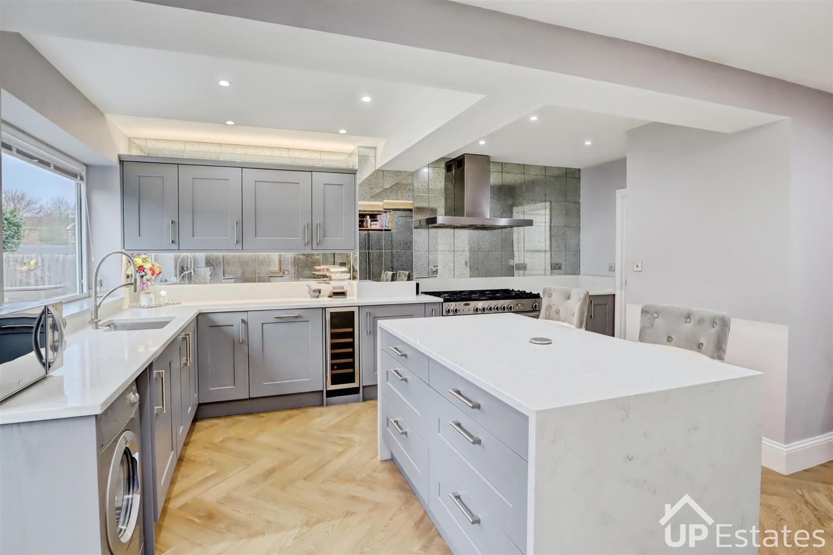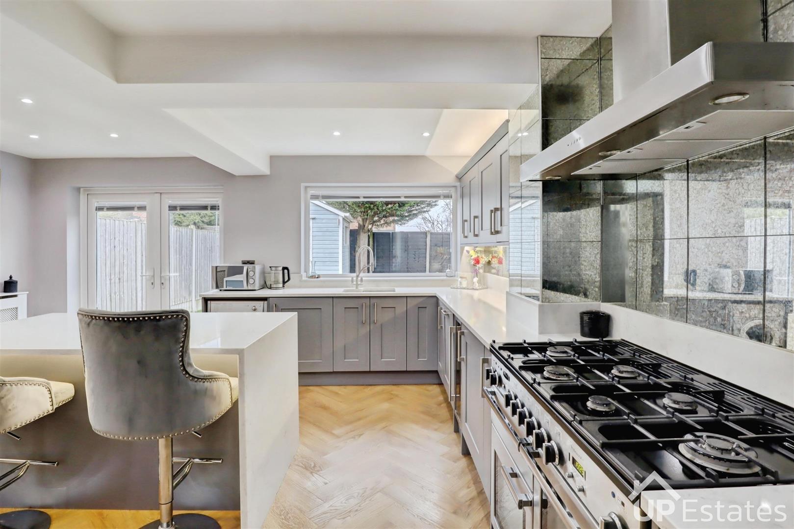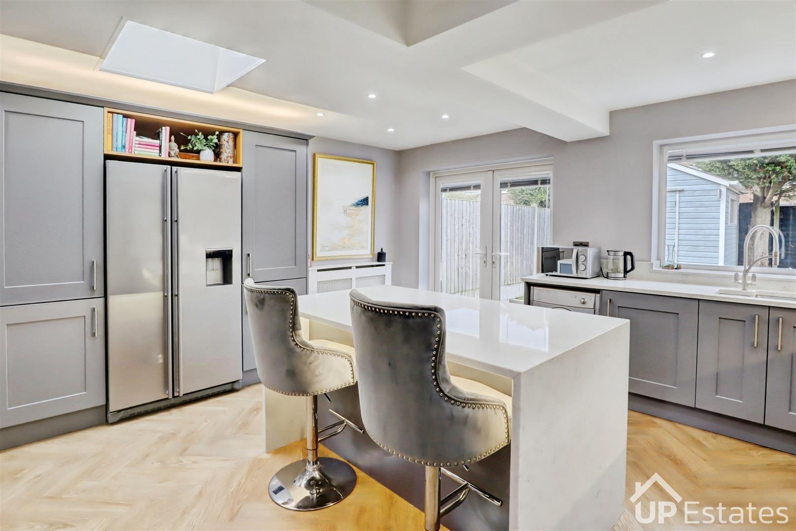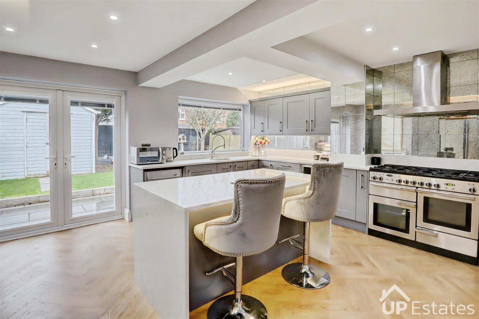 You are welcomed into the property via a bright and spacious entrance hallway, setting the tone for the rest of this lovely home. From here, you are led into a well-proportioned living room that spans the full length of the property, benefiting from dual aspect views to both the front and rear garden, creating a light and inviting space. At the end of the hallway lies the crown jewel of the home-- a modern open-plan kitchen and dining area. The kitchen is superbly fitted with an abundance of units and generous worktop space, complemented by a central island/breakfast bar. This fantastic space is perfect for both entertaining and everyday family life, with French doors opening out onto the rear garden, allowing plenty of natural light to flood the room. Completing the ground floor is a convenient WC and additional storage cupboards.