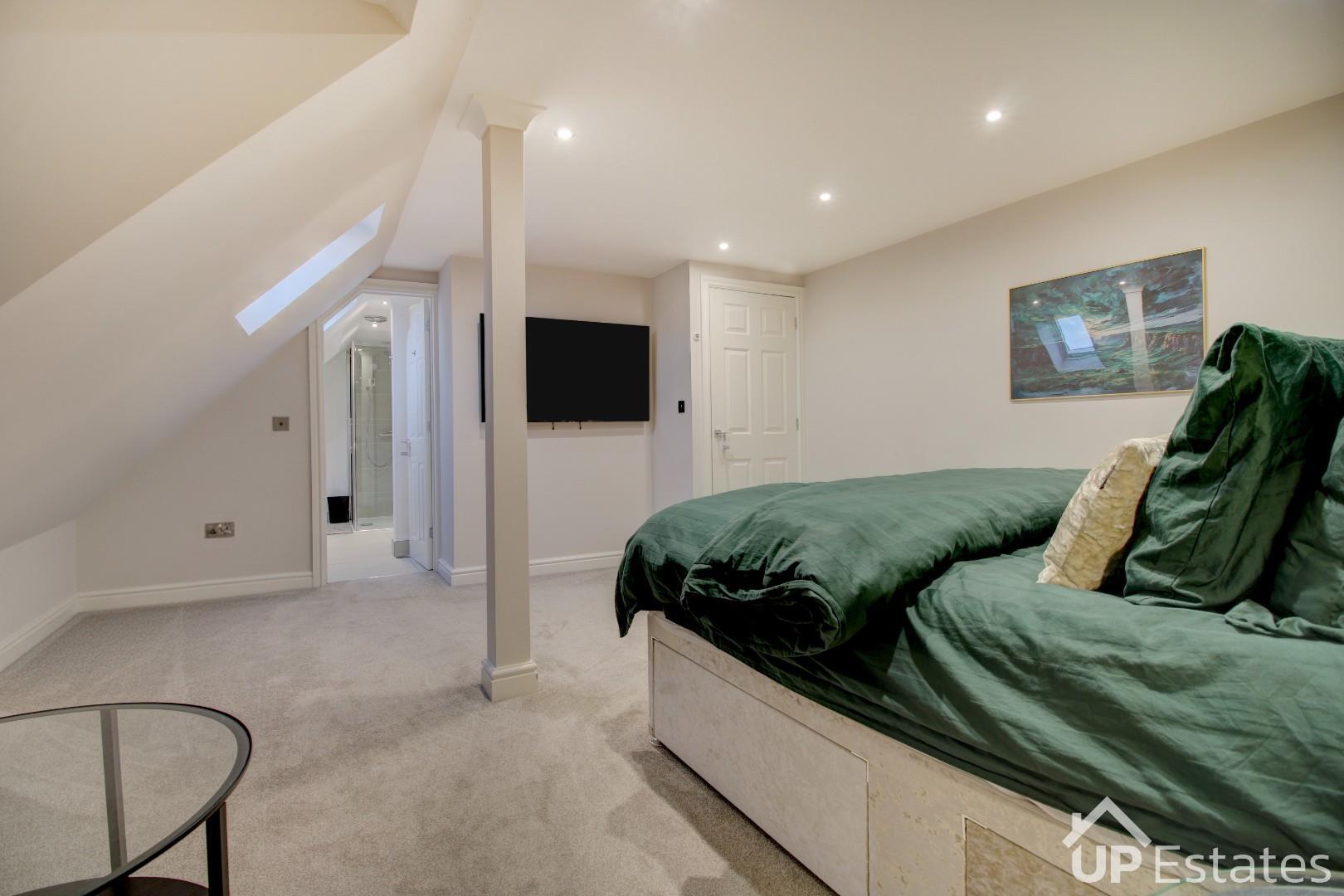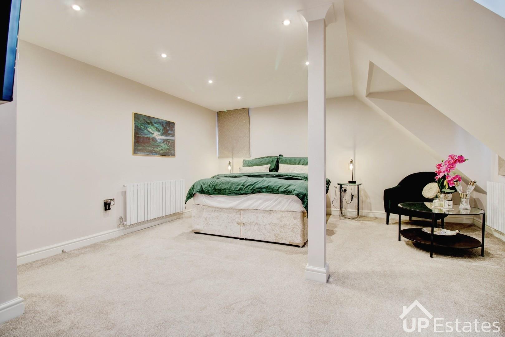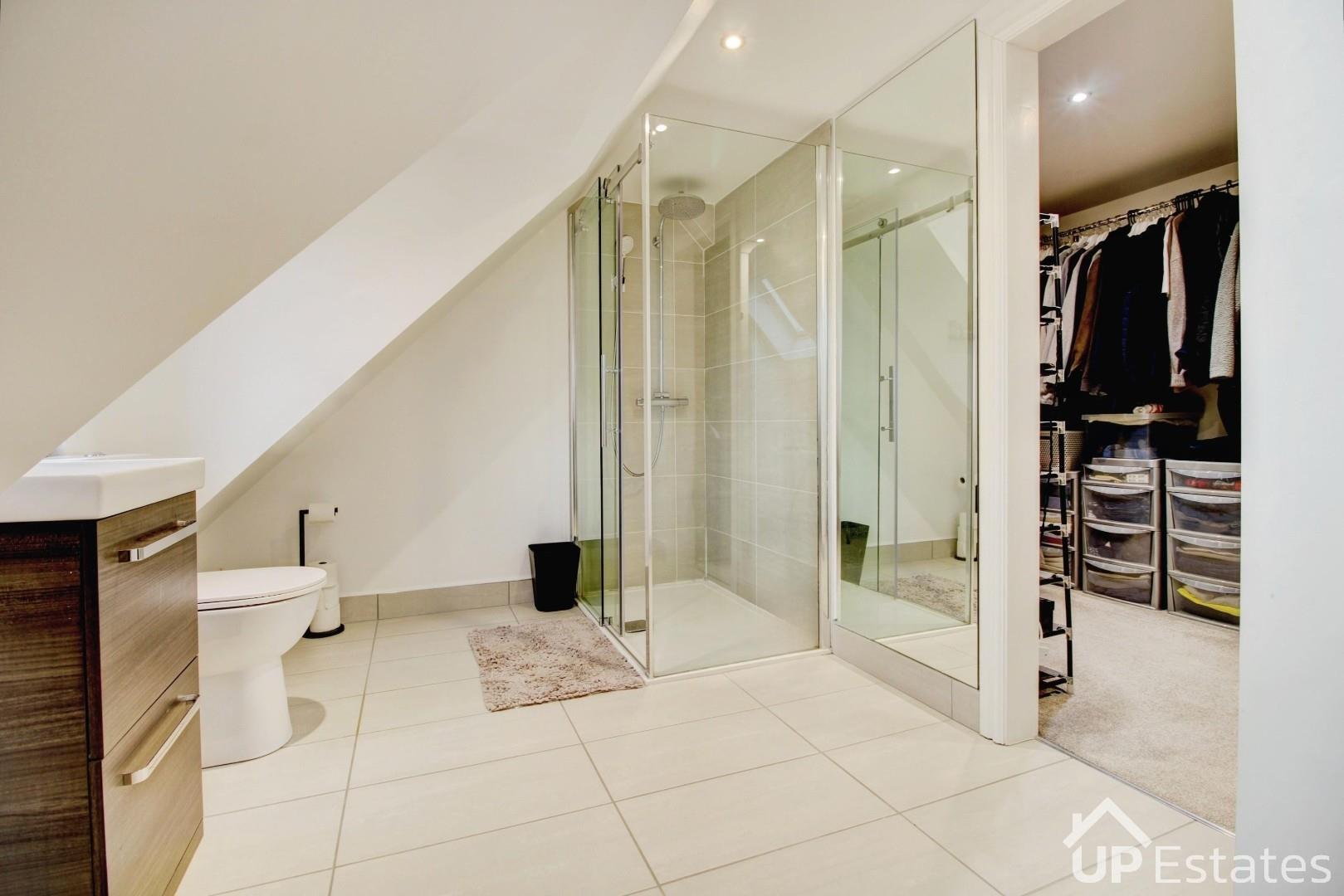 Occupying the top floor is a superb principal suite, finished to a high standard and providing a luxurious retreat. This impressive space includes a generous walk-in dressing room and a large en-suite shower room fitted with a double walk-in shower with rainfall shower head, vanity wash hand basin, and WC.