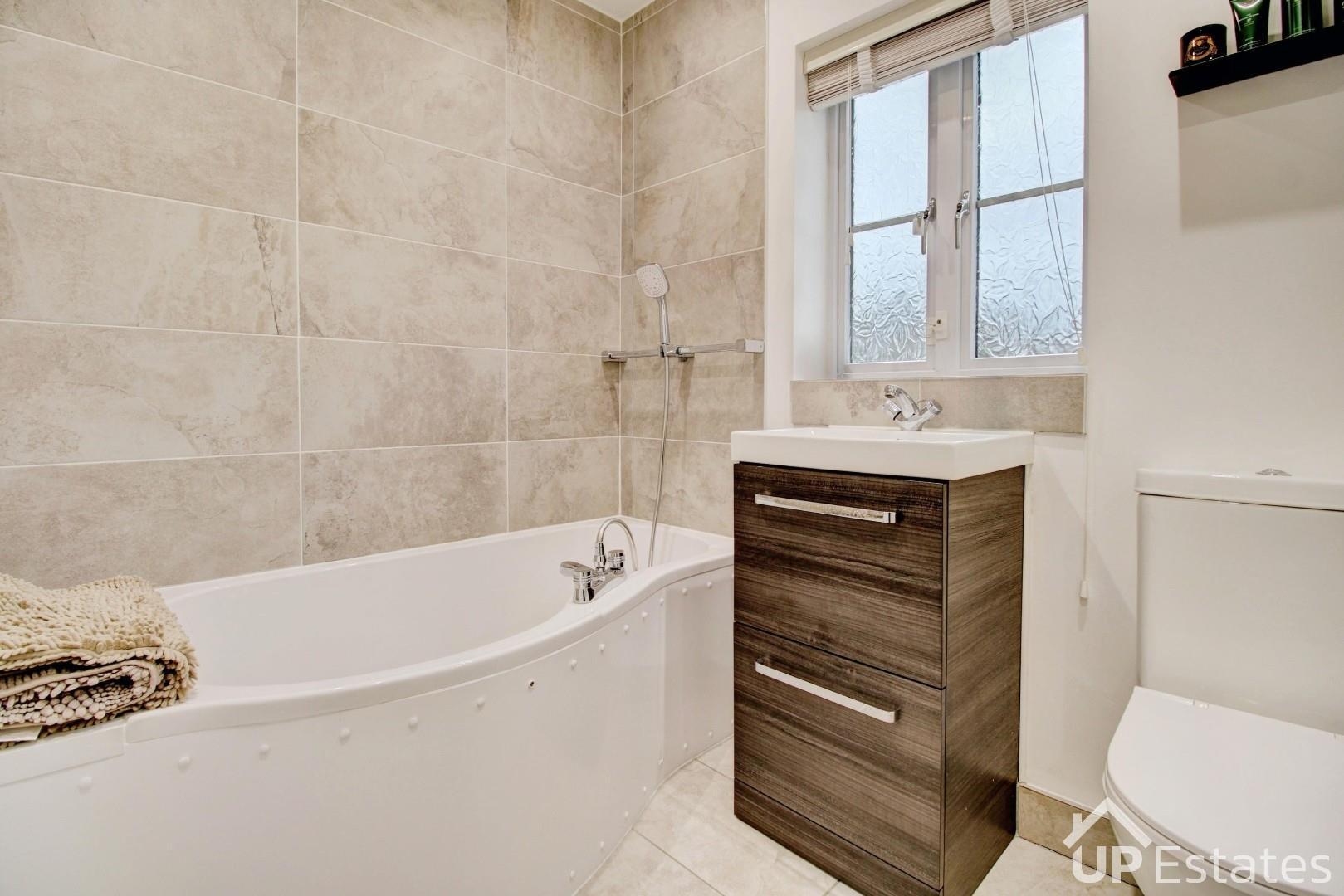 The first floor comprises three well-proportioned bedrooms and a contemporary family bathroom. Bedroom two benefits from extensive built-in wardrobes, including triple wardrobes and mirrored double wardrobes, as well as a stylish refitted en-suite shower room featuring a WC, vanity wash hand basin, and double walk-in shower cubicle. Bedroom three also offers double built-in wardrobes. The family bathroom has been recently refitted with a white P-shaped bath, vanity wash hand basin, WC, and an airing cupboard housing the recently installed boiler.
