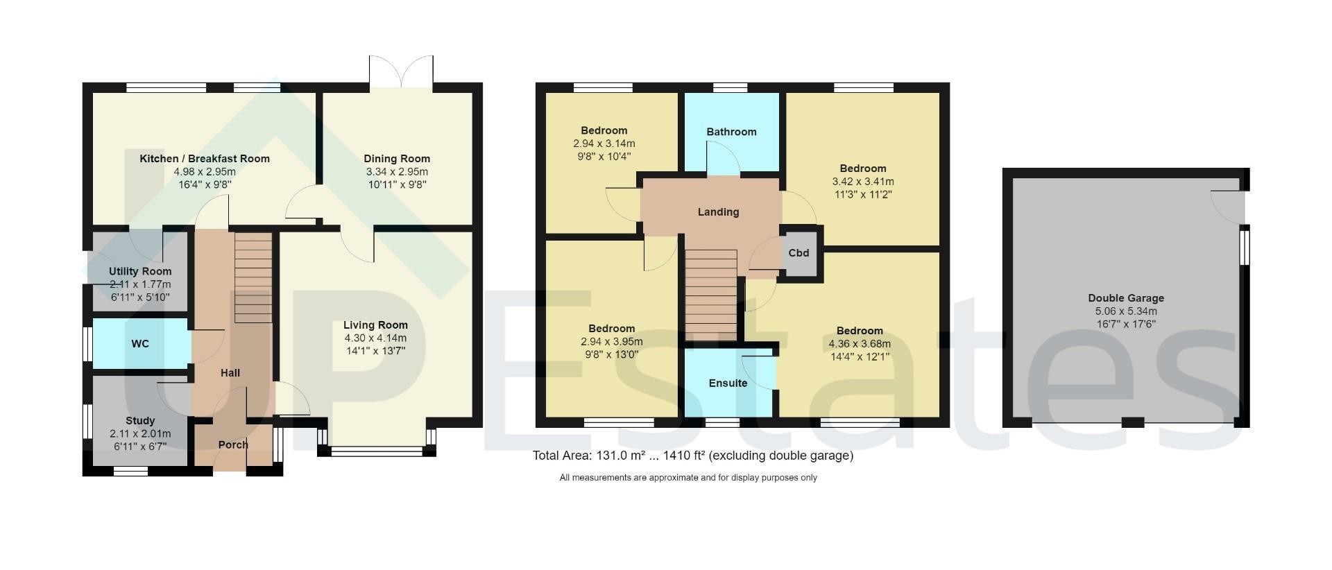 The accommodation begins with a welcoming porch opening into a spacious entrance hall. The ground floor features a large living room with a box bay window, flowing through to the dining room where double doors open onto the rear garden—ideal for entertaining. A well-proportioned kitchen/breakfast room provides ample space for family dining, complemented by a separate utility room with side access. Further ground floor benefits include a downstairs WC and a dedicated study, perfect for home working.