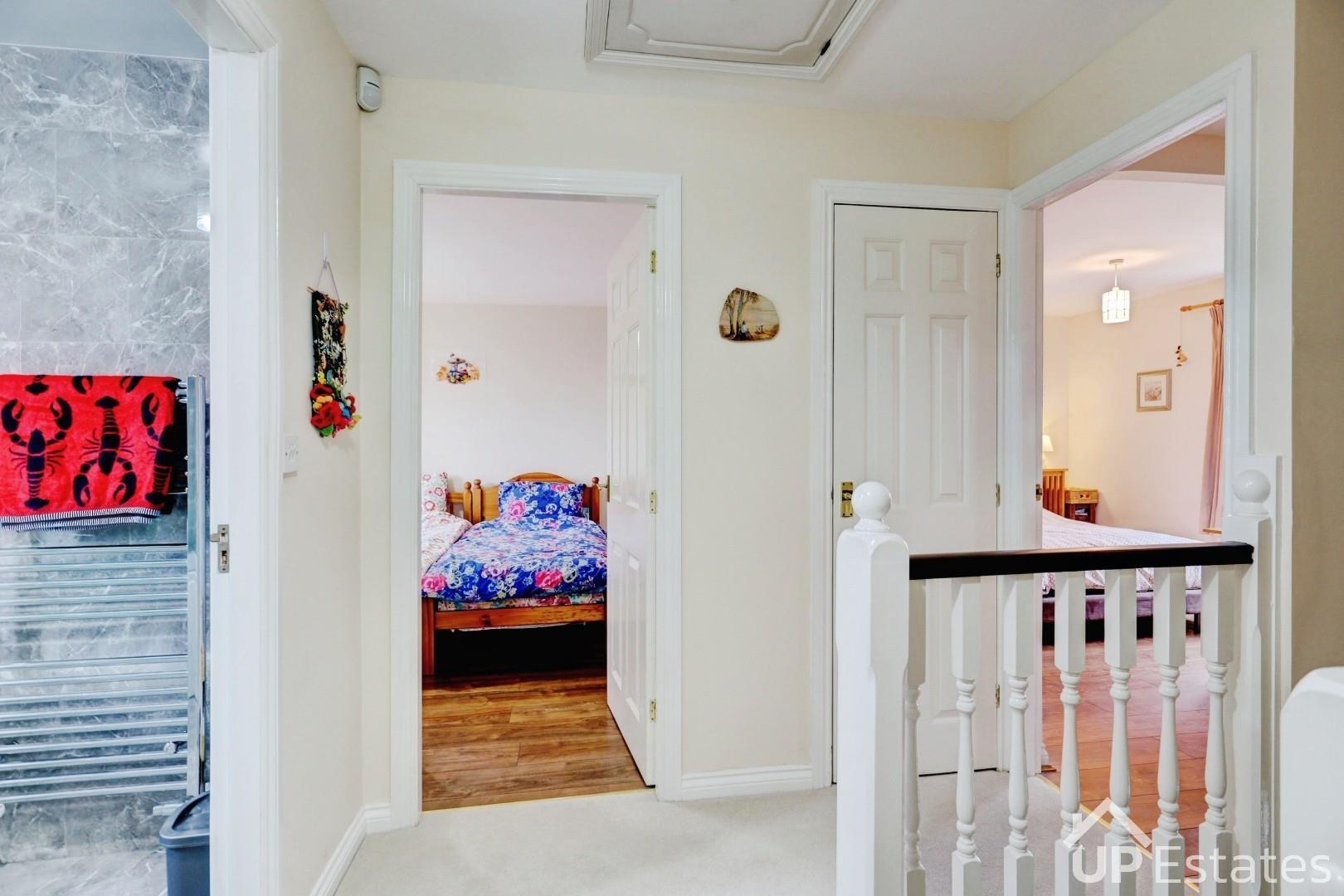 Upstairs, the property offers four genuine double bedrooms, including a generous main bedroom with its own en-suite shower room. A modern family bathroom serves the remaining bedrooms, while the loft is fully boarded and insulated, offering excellent storage.