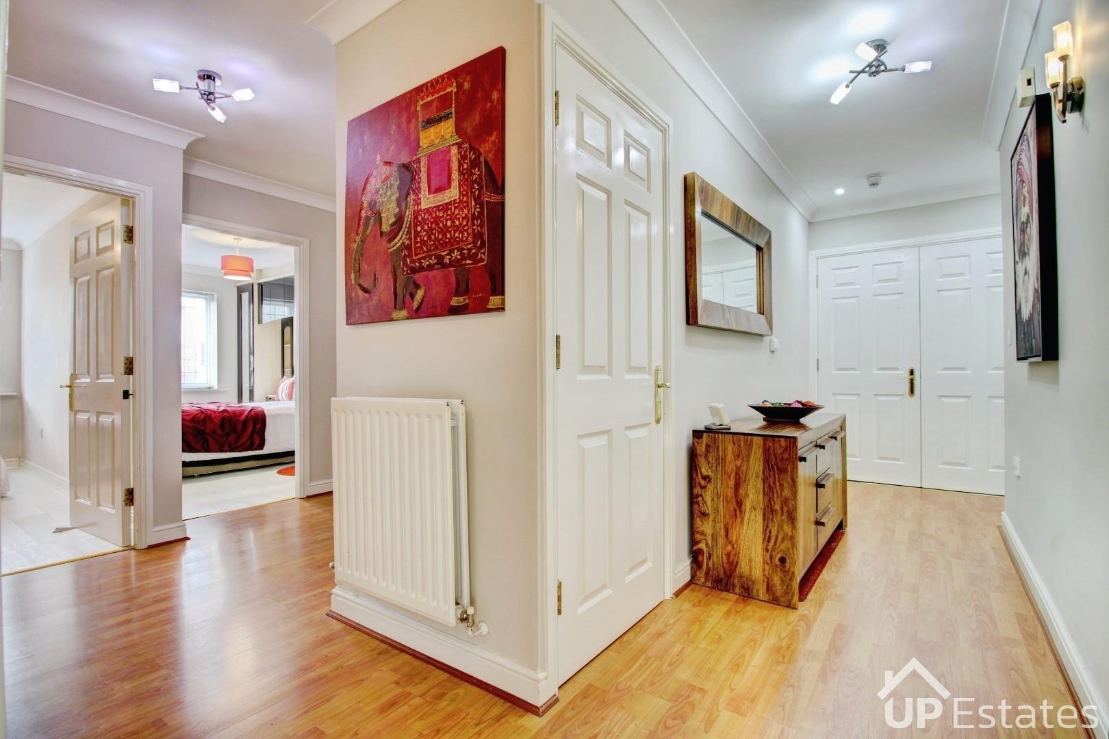 Step inside via lift or stair access into a welcoming entrance, where ample storage and a spacious, elegant hallway immediately create a sense of space and order. The apartment itself is designed for both style and functionality: a generously proportioned, fully fitted kitchen flows seamlessly through to a stunning living area, complete with a characterful red brick fireplace, creating a warm and inviting atmosphere for both everyday living and entertaining.