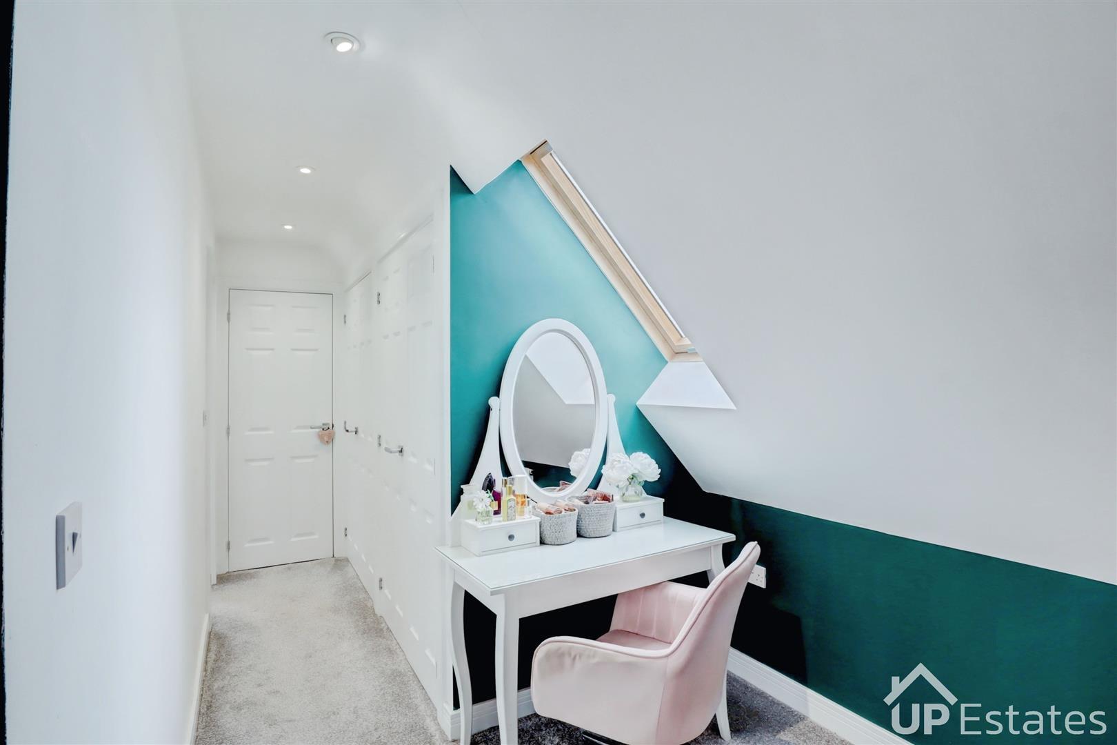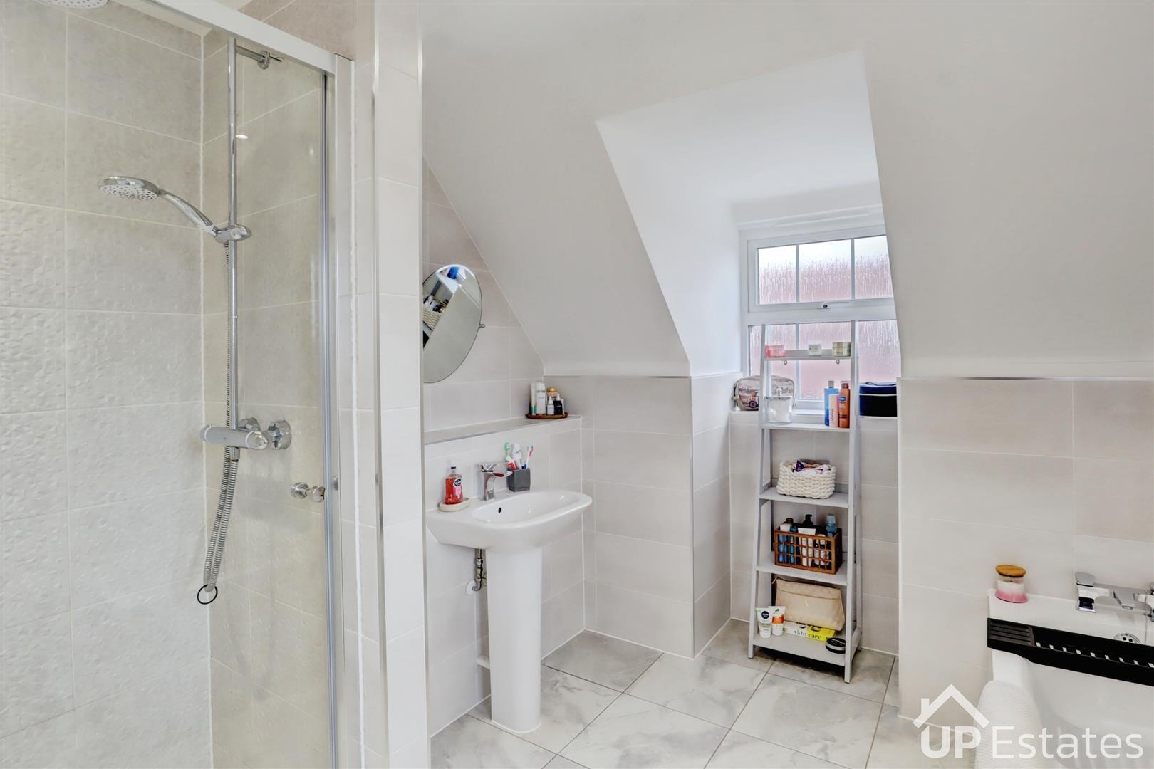 The first floor comprises four well-proportioned bedrooms, a modern family bathroom, and an en-suite shower room serving one of the bedrooms — ideal for guests or older children. Occupying the entire top floor is the impressive principal bedroom suite, complete with extensive built-in wardrobes and storage. It also benefits from a generous en-suite bathroom featuring both a bath and a standalone shower.