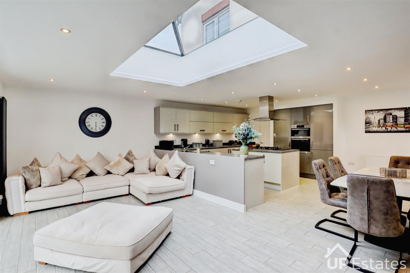 The ground floor has been thoughtfully extended to create a superb open-plan kitchen, dining and living area. This impressive space forms the true heart of the home, featuring striking bi-fold doors opening onto the rear garden and a large sky lantern that floods the room with natural light. Ideal for entertaining friends and family, this contemporary living space perfectly blends style and practicality. In addition, there is a separate living room providing a cosy retreat for quieter evenings, along with a convenient downstairs WC and a separate utility room — adding both luxury and functionality to the layout.