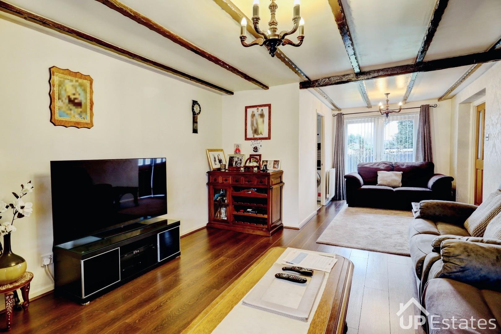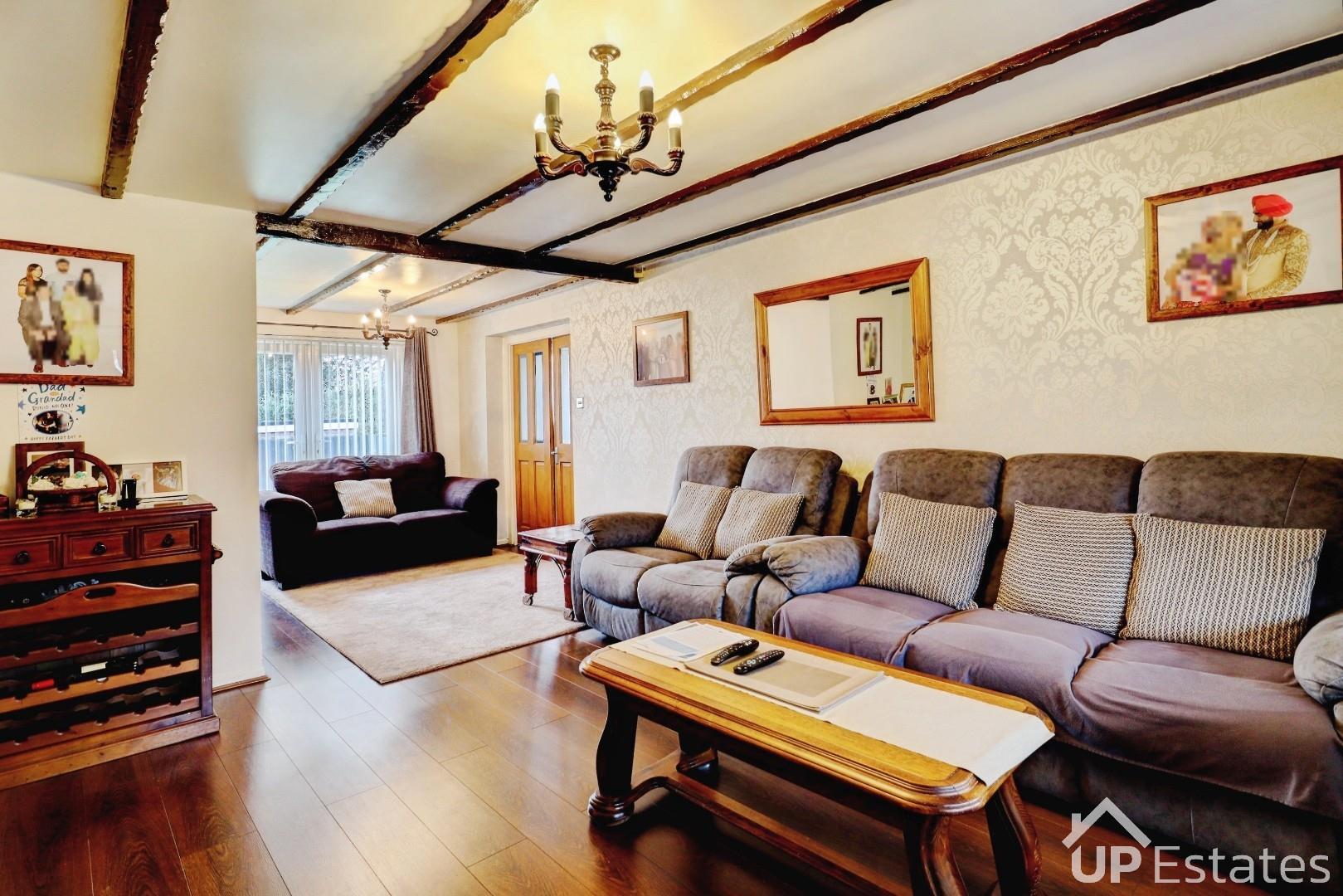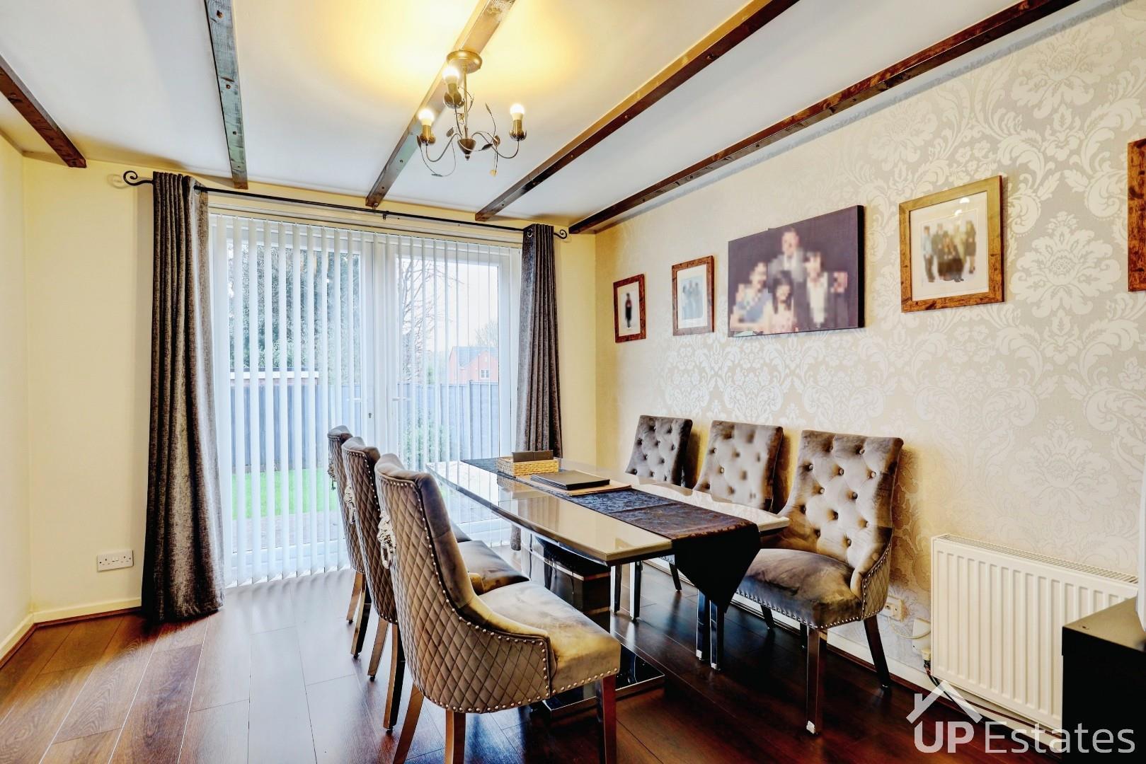 Well presented open family room with feature ceiling wooden beams, having a central heated radiator and a double glazed bay window to the front aspect of the property. Leading through to the dining area.