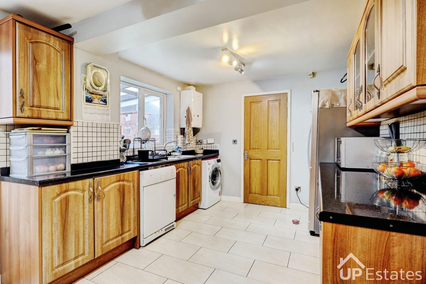 Spacious kitchen including a matching range of wall and base mounted units with roll top work surfaces over, a stainless steel sink with drainer and mixer tap, integrated oven, hob and extractor fan, space and plumbing for additional appliances, space for a fridge freezer, having a central heated radiator, double glazed window and door accessing the rear garden of the property. Also a door providing access to the garage store.