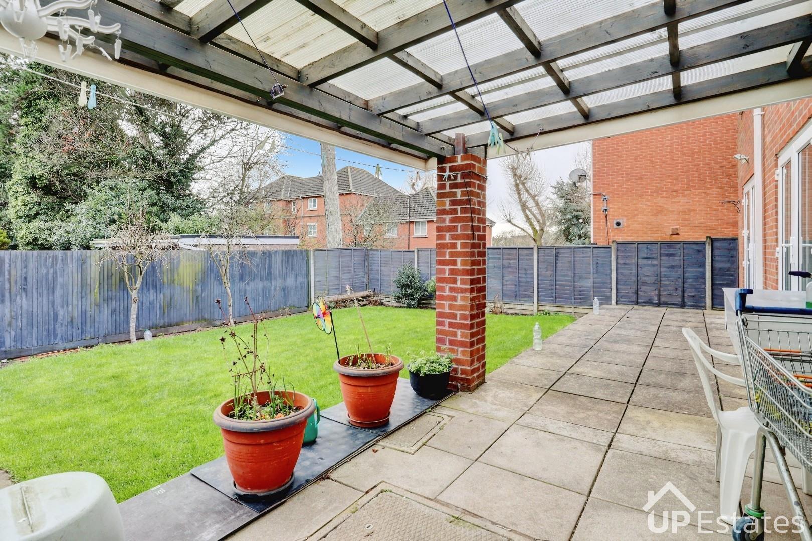 A private rear garden with a veranda canopy over part of the paved seating area followed by a lawn with fencing along the boundaries.