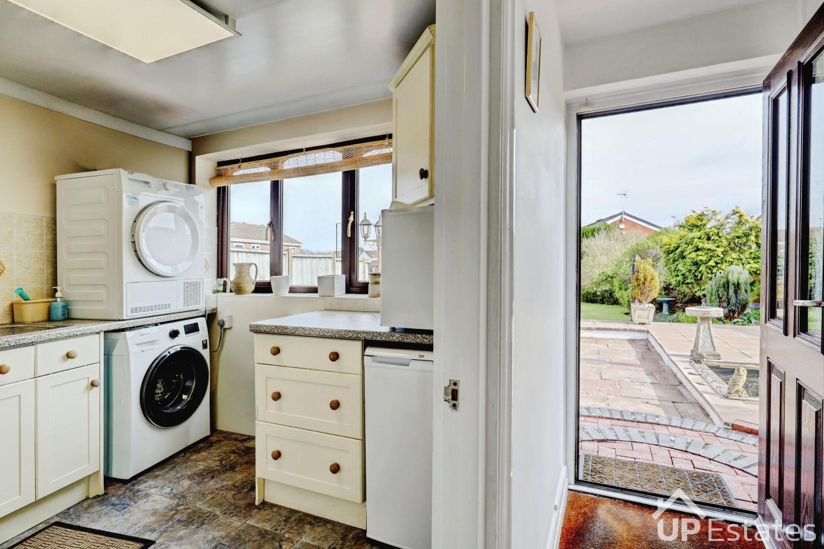 The ground floor begins with an entrance porch leading into a spacious living room, which flows through to a separate dining room, creating a fantastic open feel. From the dining area there is access to both the kitchen and the standout sun room, which has been finished to a high standard and provides an excellent space for entertaining or relaxing while overlooking the garden. The kitchen is well proportioned and offers ample storage, with further benefits including a useful storage cupboard, a downstairs shower room, internal access to the large single garage and a spacious utility room with a door leading to the rear garden.