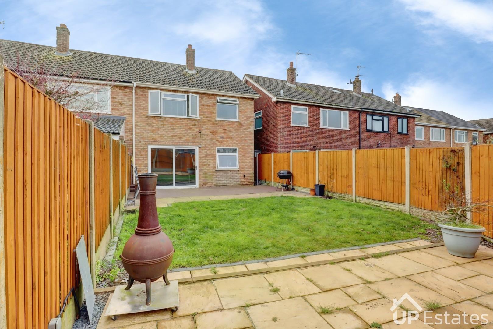 Upon entering the property, you are welcomed by an entrance hallway leading into a generous lobby area, which serves as the central hub of the home. To the front, there is a dining area for family meals or entertaining guests. The lobby also provides access to both the modern kitchen and the bright, spacious living room. The modern kitchen is fitted with built-in cupboards and offers pleasant views over the rear garden, creating a practical yet inviting cooking space. The living room is a standout feature of the home, boasting ample space and sliding patio doors that open directly onto the garden, allowing natural light to flood the room and creating a seamless indoor-outdoor living experience—ideal for relaxing or entertaining all year round. Upstairs, the property comprises three well-sized bedrooms and a stylish family bathroom, complete with a bath and overhead shower.