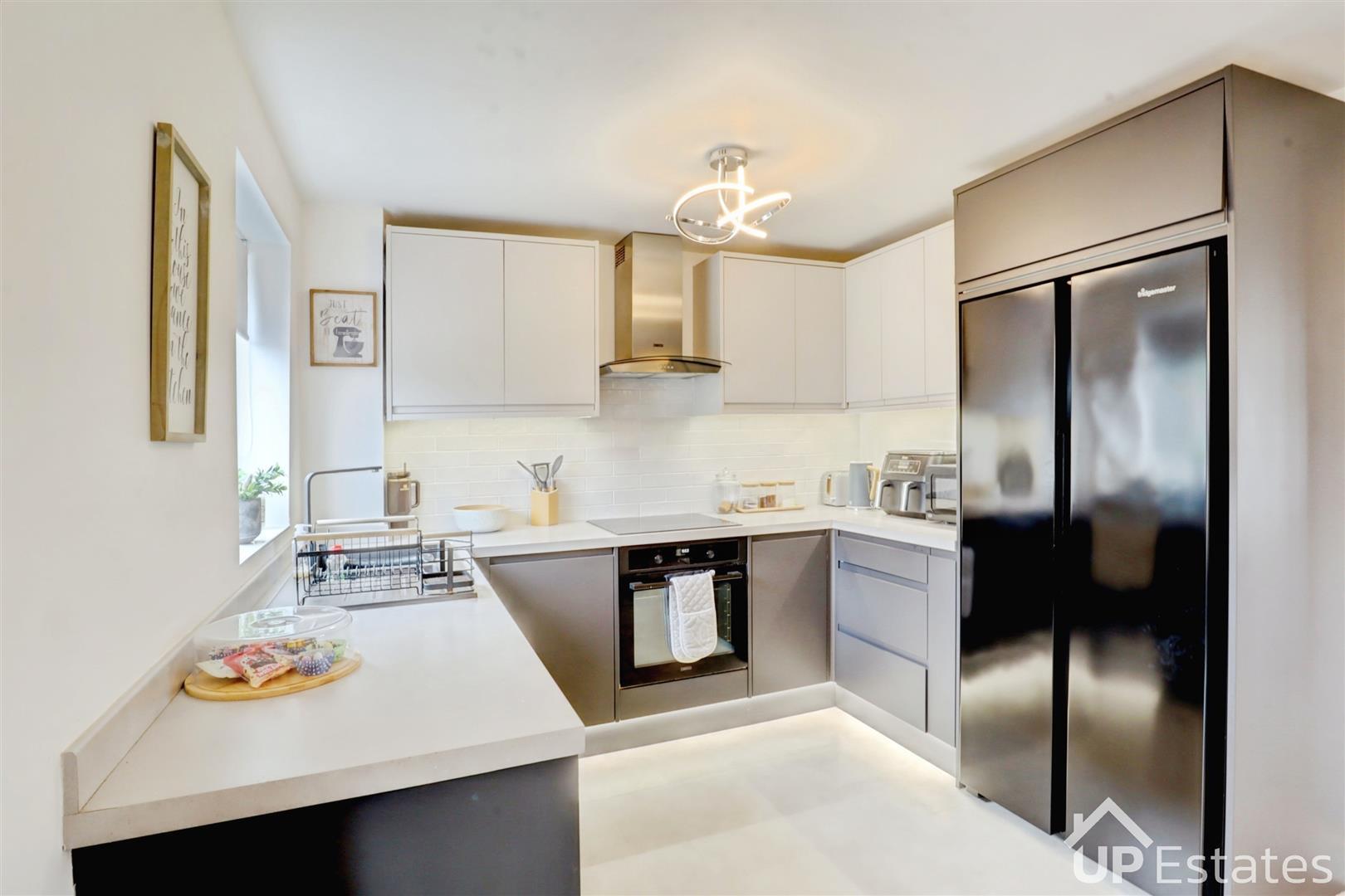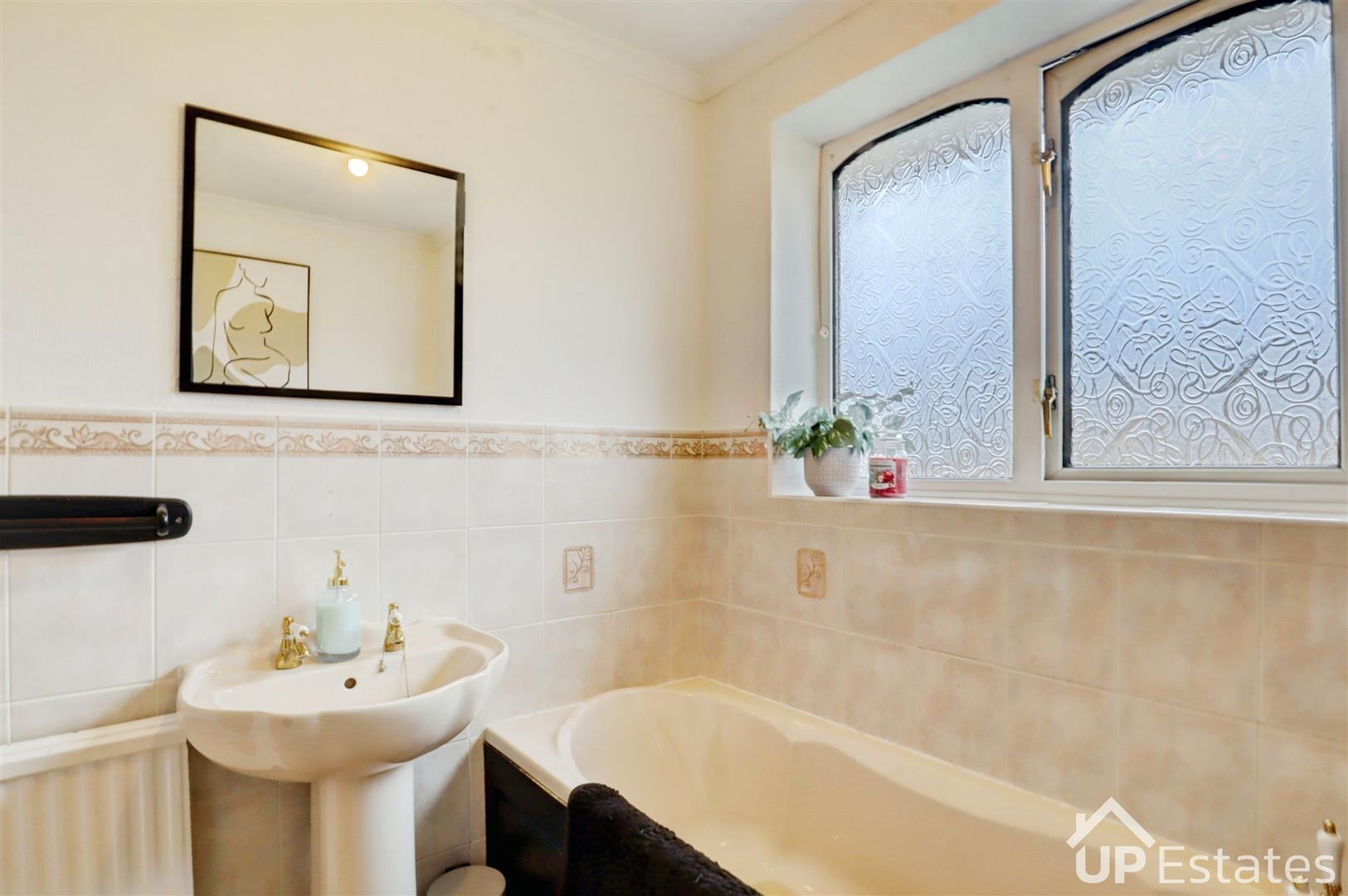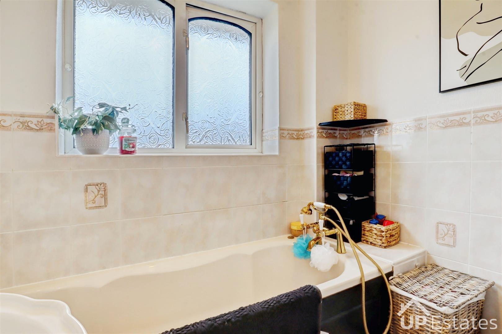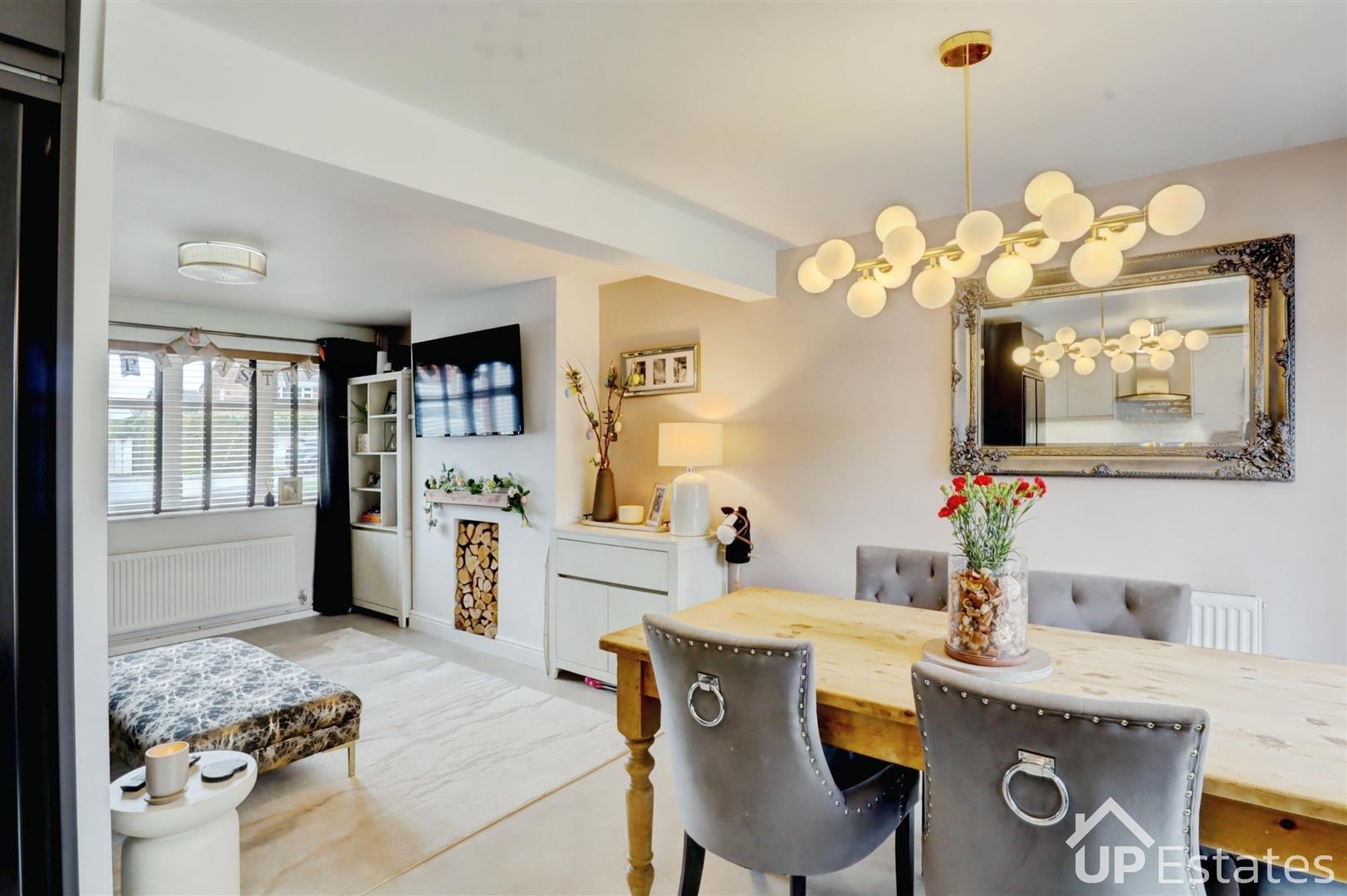 The contemporary kitchen is well-equipped with a range of built-in units, offering both practicality and flexibility for cooking and storage. The dining area is enhanced by French doors, which open out onto the rear garden and patio, allowing natural light to flood the space and providing easy access to outdoor living. Upstairs, the property comprises three well-proportioned bedrooms, perfectly suited to a growing family or those needing additional workspace. A modern family bathroom completes the first floor.