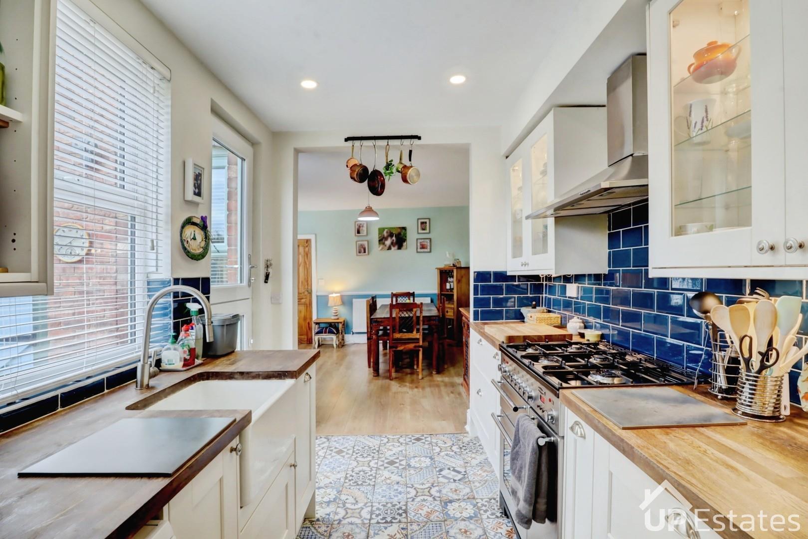 The property welcomes you through a spacious side entrance hallway, setting the tone for the generous accommodation throughout. To the front of the home, the bright and airy living room provides a comfortable space to relax and unwind, filled with natural light. Moving towards the rear, you will find a charming dining area that flows seamlessly into the beautifully presented kitchen. Recently modernised, the kitchen perfectly balances contemporary style with rustic charm, featuring stunning tiled flooring that enhances the home’s character. From here, there is direct access to the rear garden and patio area, ideal for indoor-outdoor living. The ground floor further benefits from a separate utility area and a convenient WC, adding both practicality and flexibility for modern family life.