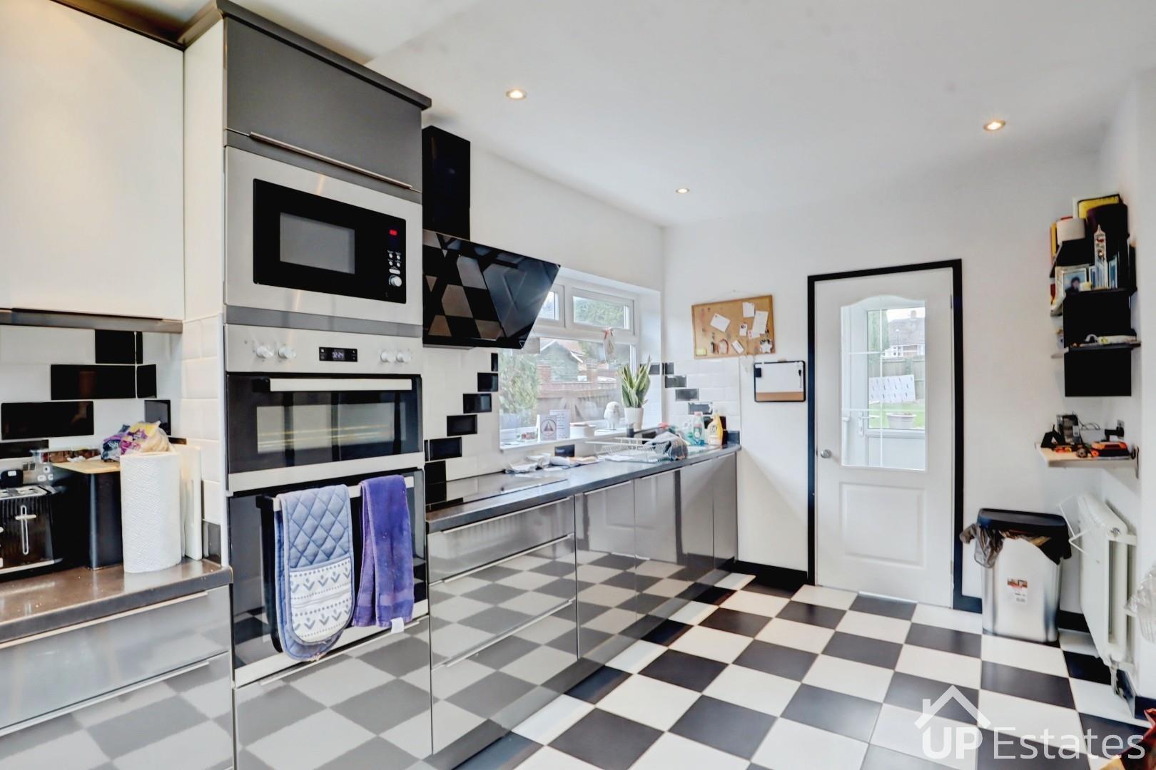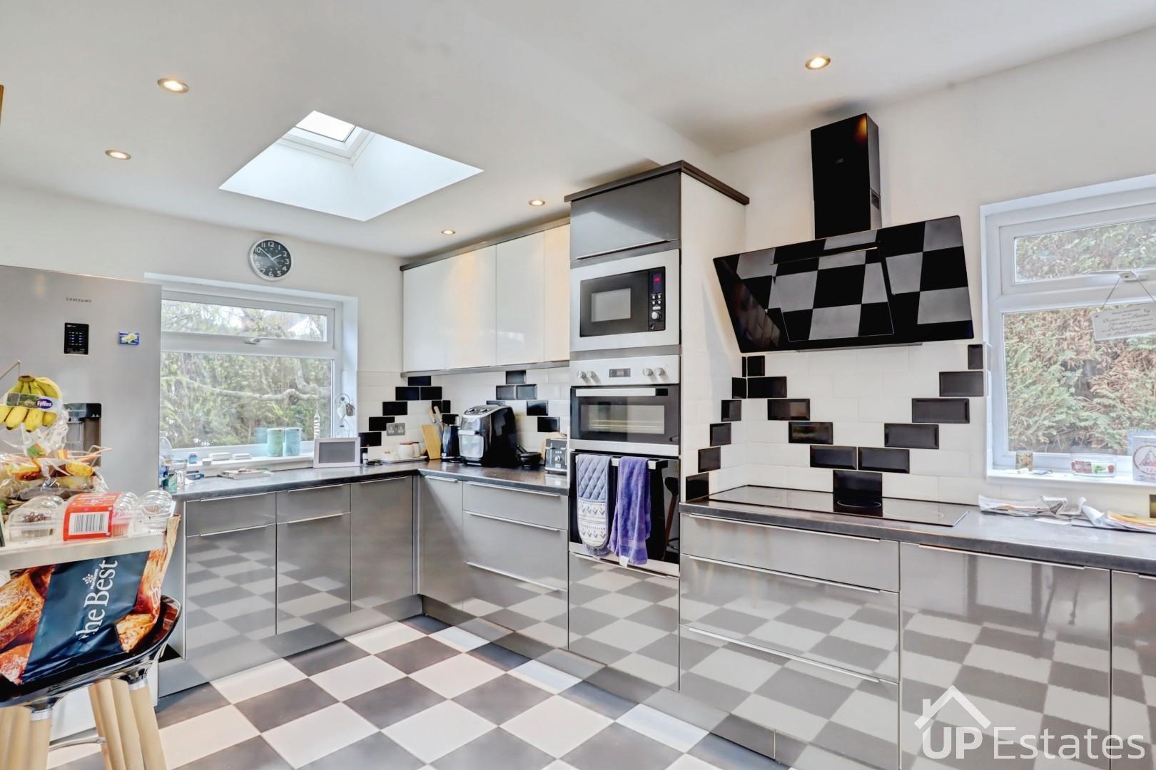 Upon entering the property, you are welcomed into a generous dining room positioned at the front of the home, creating an inviting space for both everyday living and entertaining. This leads seamlessly through to a contemporary, well-appointed kitchen, featuring an array of built-in units and ample worktop space. Flooded with natural light from multiple windows and a skylight, this bright and airy area forms the true heart of the home.