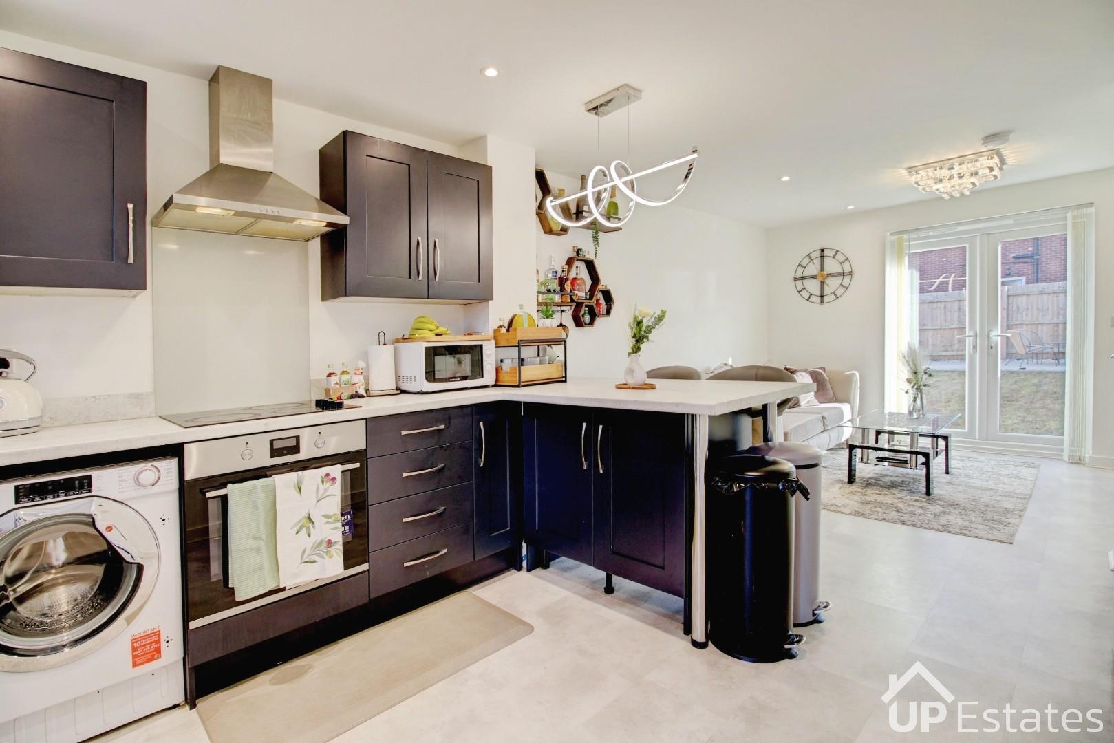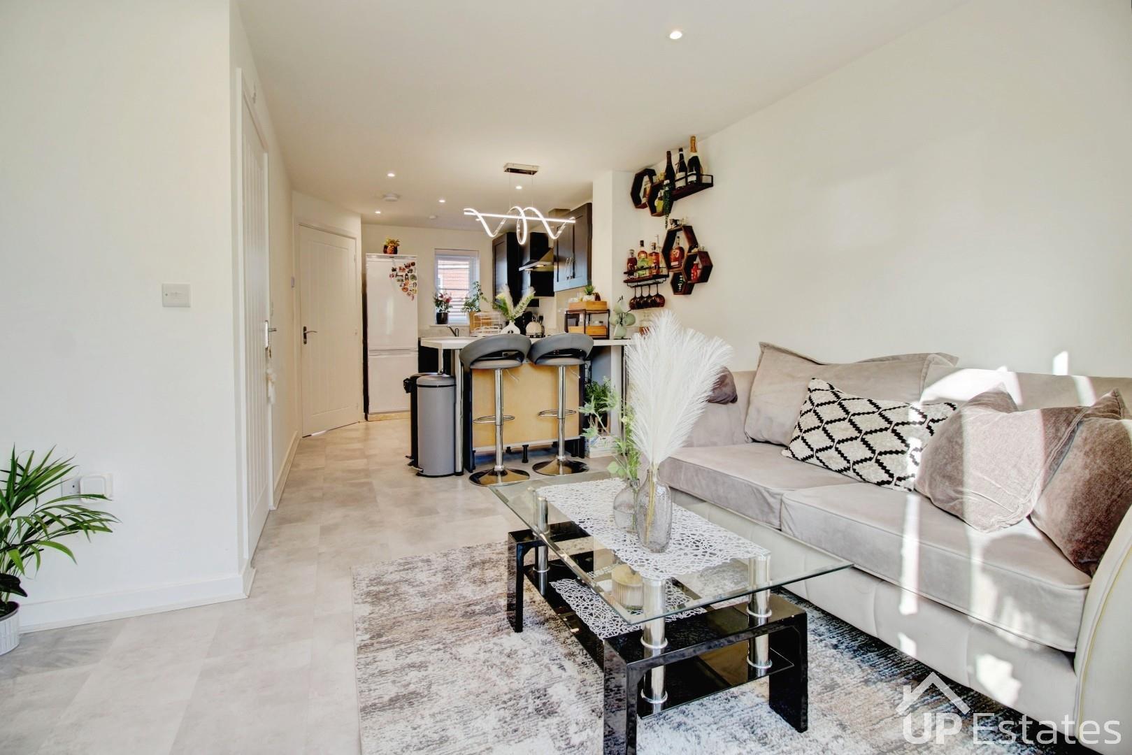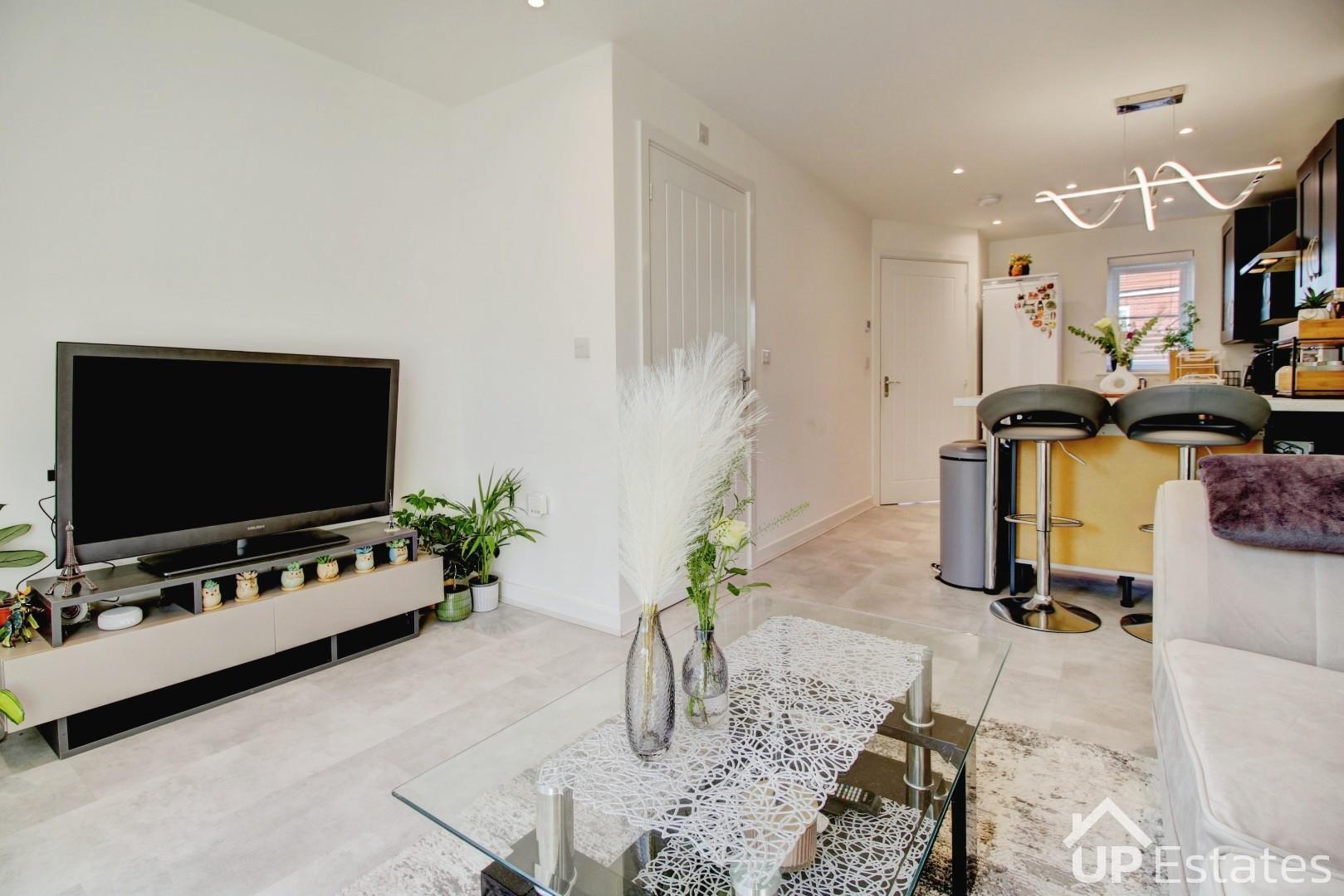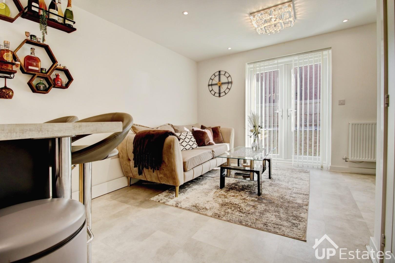 Upon entering, you are welcomed into a stunning open-plan kitchen and living area—the true heart of the home. This stylish space features integrated units, an oven, hob, extractor fan, sink, and a convenient breakfast bar, along with ample room for both dining and relaxation. French doors flood the room with natural light, while the neutral décor creates an elegant and inviting atmosphere—perfect for entertaining family and friends.