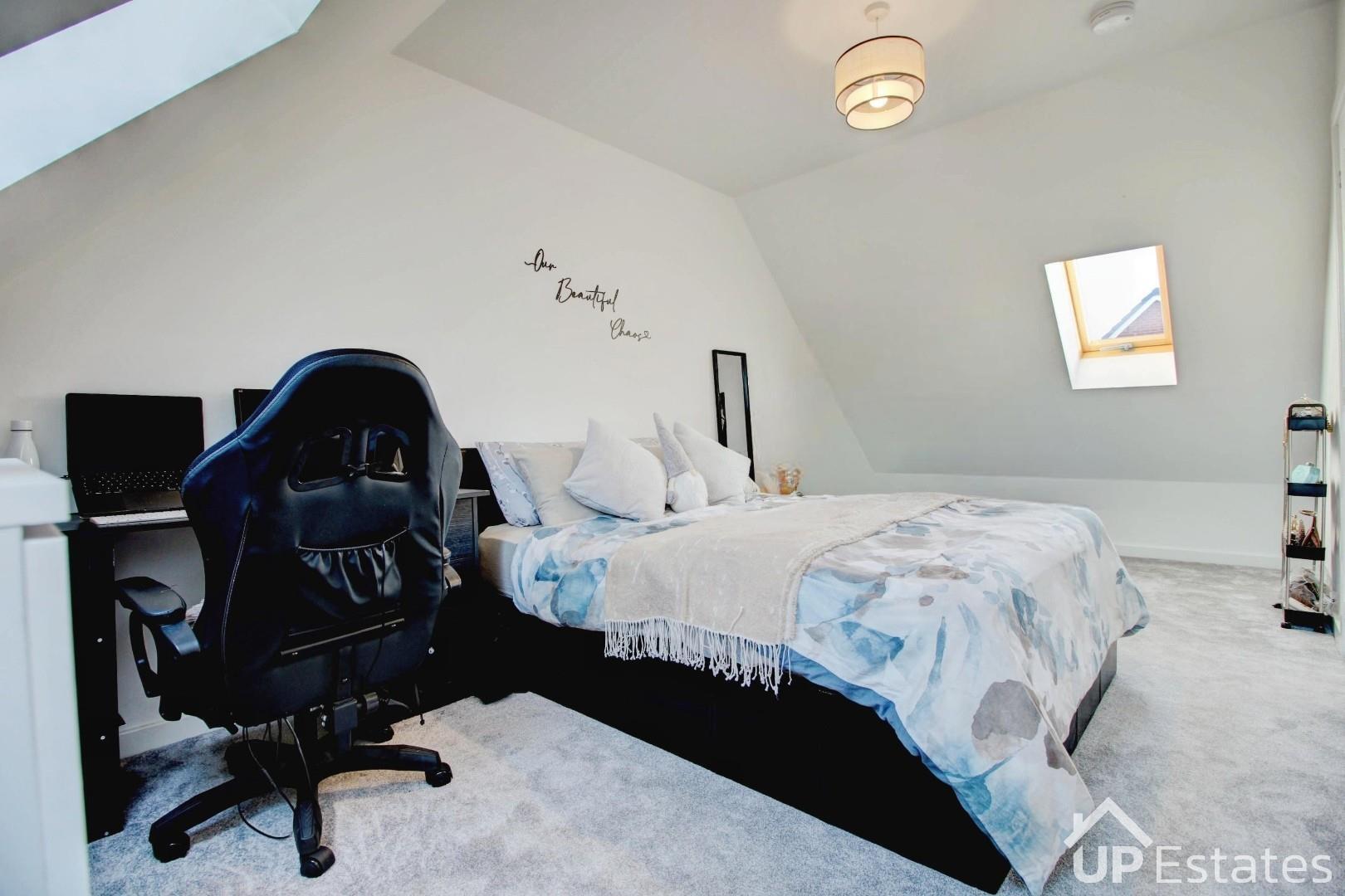On the second floor, the impressive master bedroom provides a peaceful sanctuary. Featuring three Velux skylights, the room is bathed in natural light, creating a bright and airy space—ideal for relaxing with a good book in comfort.