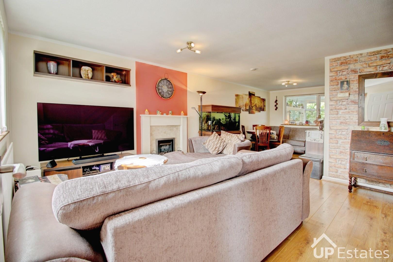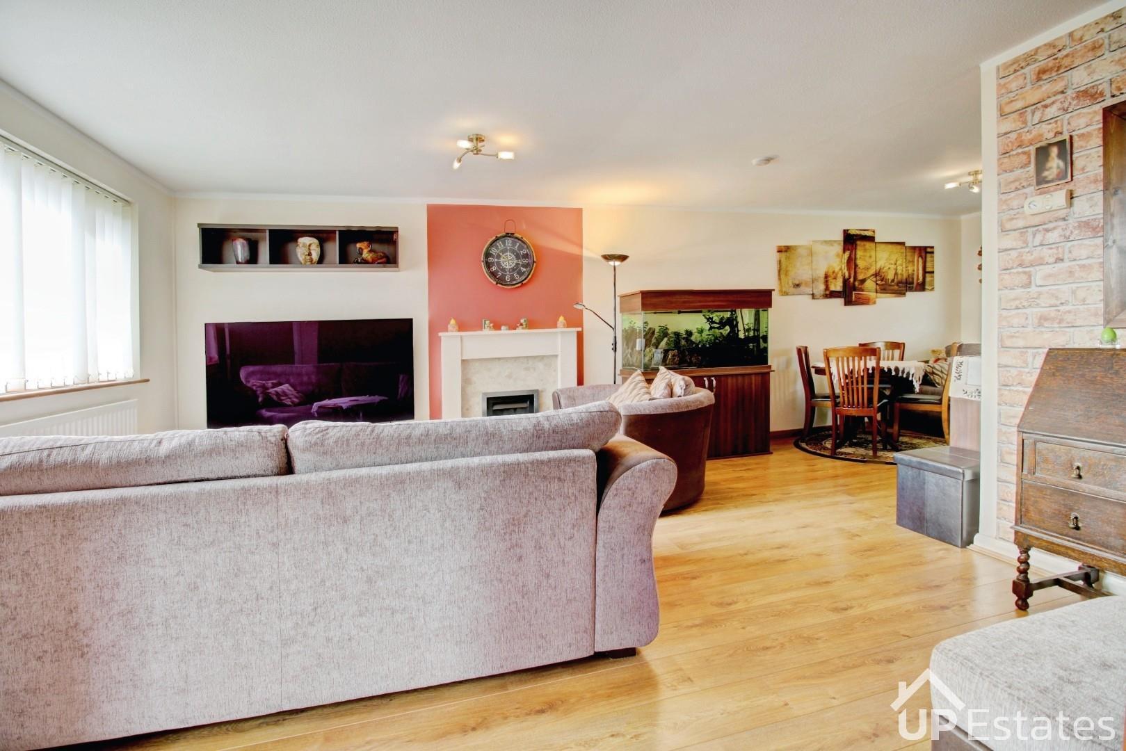 The property is approached via a front lawn overlooking open green space, leading into a welcoming entrance hall. The heart of the home is the open-plan lounge and dining area, featuring dual-aspect windows that flood the space with natural light, alongside a charming gas fireplace creating a warm and inviting atmosphere.
