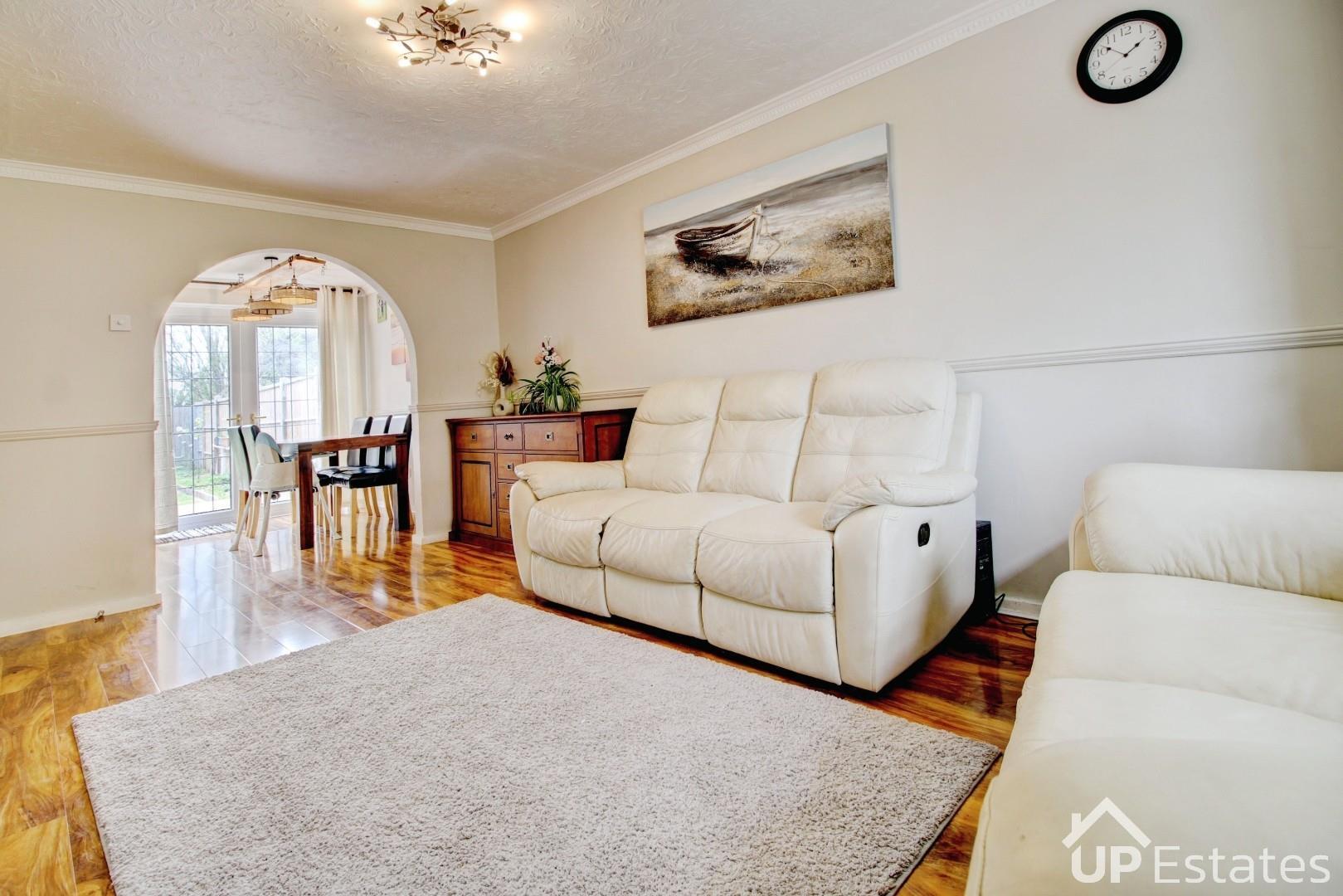 An open archway leads seamlessly into the dining room, ideal for both everyday family living and entertaining. French doors open directly onto the rear garden, allowing natural light to flood the space and providing effortless indoor-outdoor living during the warmer months. A convenient downstairs WC, newly fitted in 2025. The kitchen is well-equipped with an integrated oven, grill, gas hob, extractor fan and sink, along with space for additional appliances. A walk-in pantry provides excellent storage, while further access leads to a garage store with power and lighting.