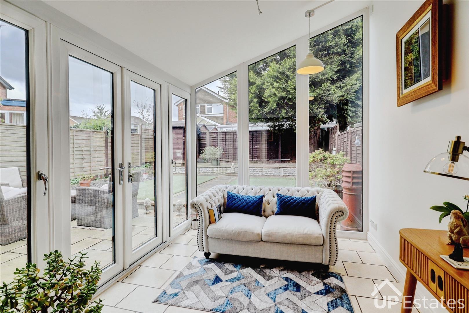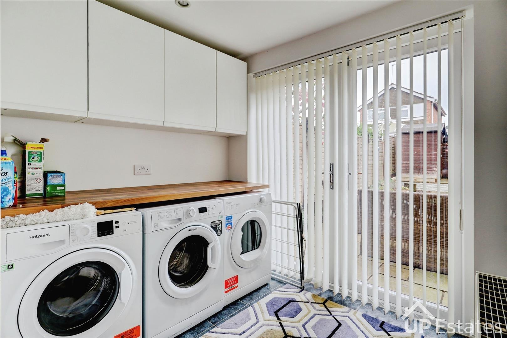 Finished to a high standard throughout, the ground floor comprises a spacious living room with a bay window, and an open plan kitchen diner providing a fantastic space for family living. A standout feature of the home is the beautifully designed sun room, complete with floor to ceiling windows, creating a bright and stylish additional living space. There is also a downstairs WC and a generous utility room with double doors leading to the rear garden, along with internal access to the garage.