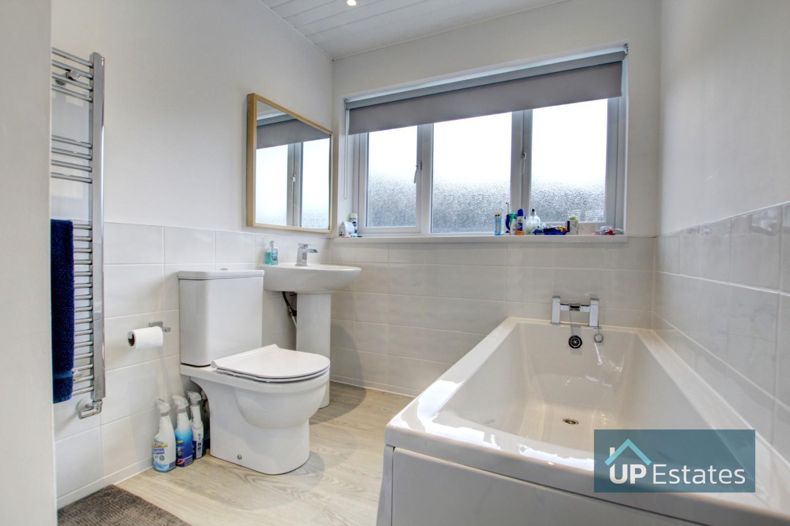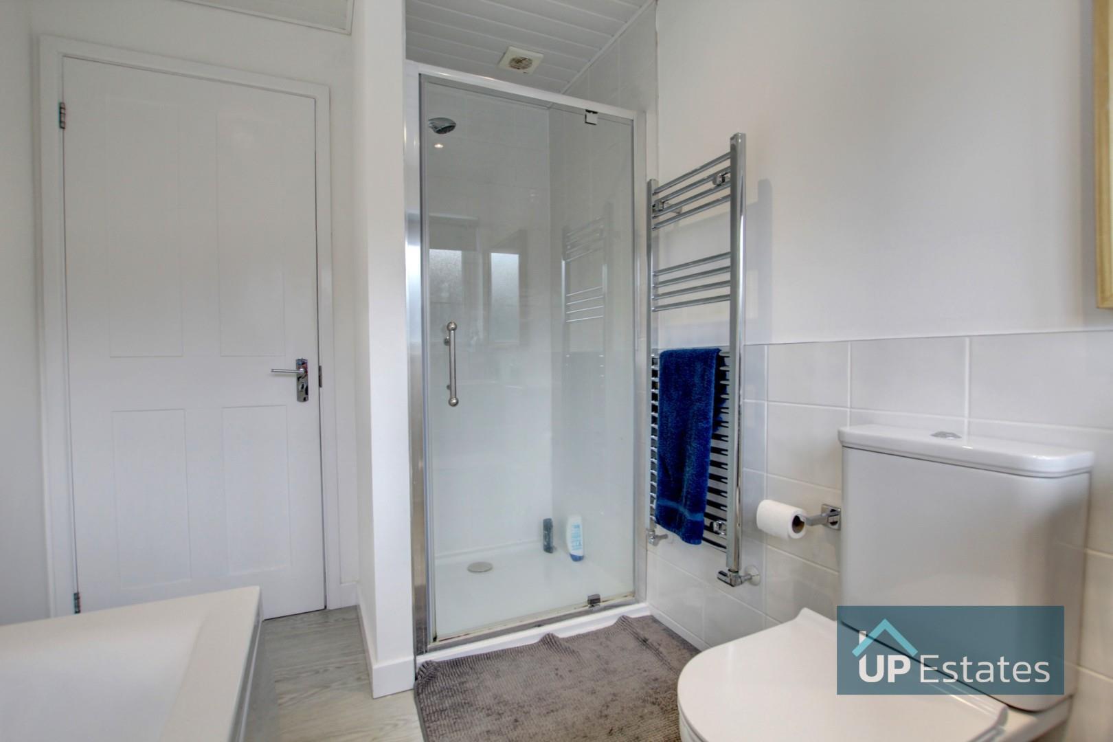 A sizable room being partially tiled, splash back ceiling, having paneled bath with mixer taps, separate walk in shower cubicle, pedestal hand wash basin, low level WC, central heated towel rail, & opaque double glazed windows.